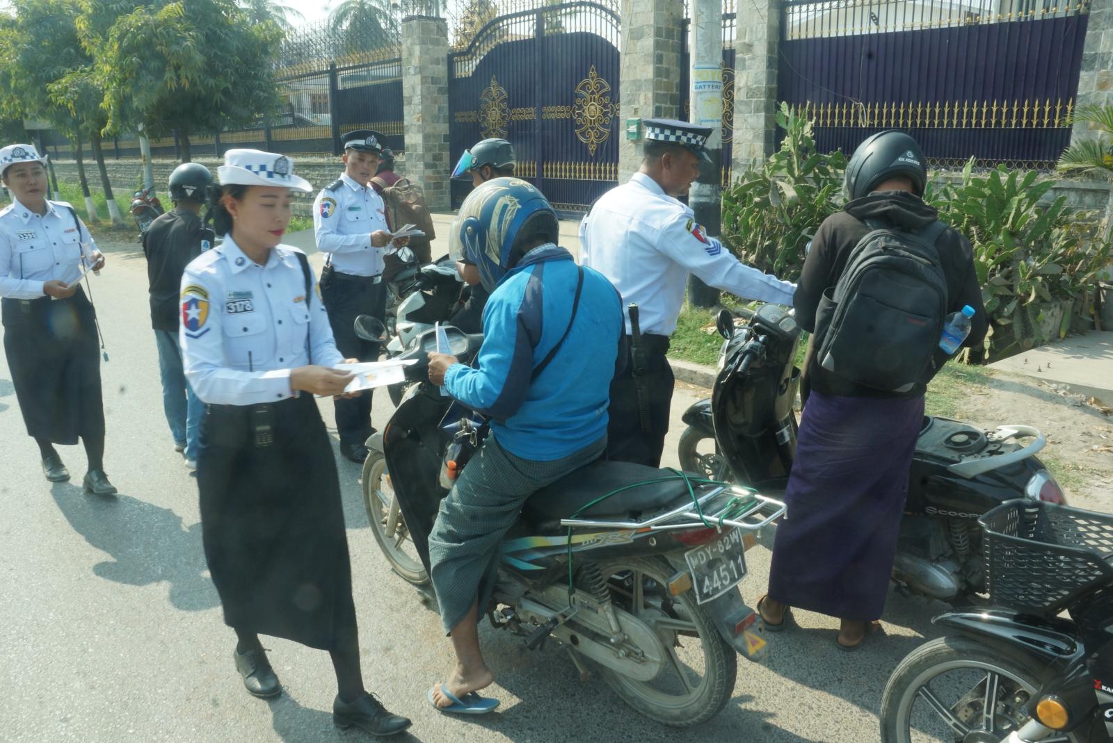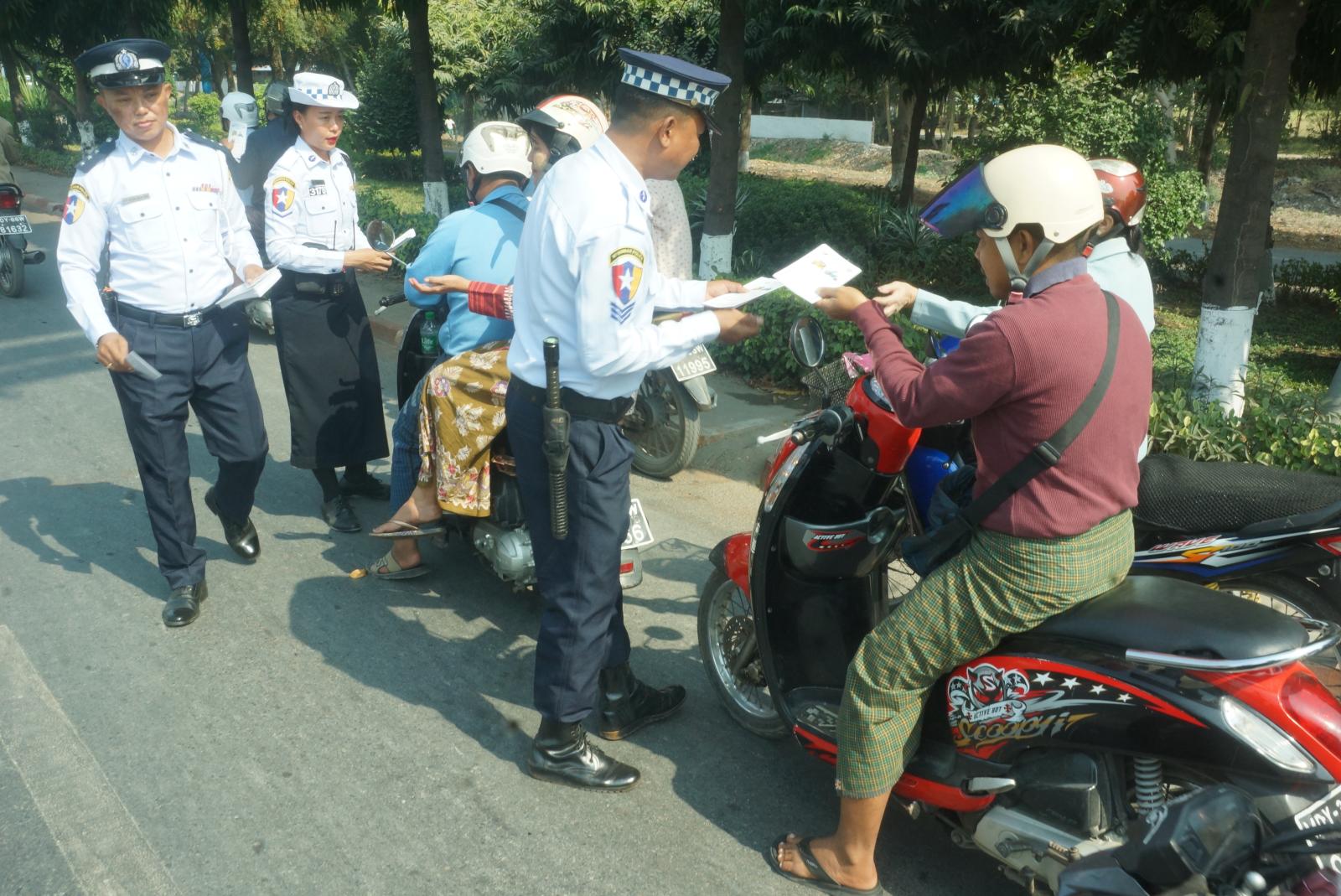 မန္တလေးတိုင်းဒေသကြီး၊ ချမ်းမြသာစည်မြို့နယ်တွင် ပြည်သူများနှင့်မော်တော်ယာဉ်မောင်းများ ယာဉ်စည်းကမ်းလမ်းစည်းကမ်း သိရှိလိုက်နာစေရန်အတွက် "လက်ယာဘက်အစွန်ဆုံး ယာဉ်ကြောကိုကပ်လို့ သုံးဘီးတပ်ယာဉ်နှင့်မော်တော်ဆိုင်ကယ်မောင်းနှင်စို့" လက်ကမ်းစာစောင်ဖြန့်ဝေခြင်းကို ယနေ့နံနက်ပိုင်းက လူစည်ကားရာနေရာများ၌ ဆောင်ရွက်သည်။