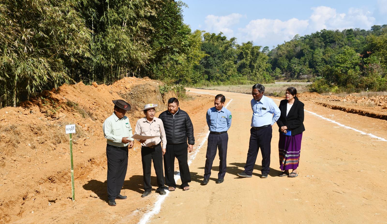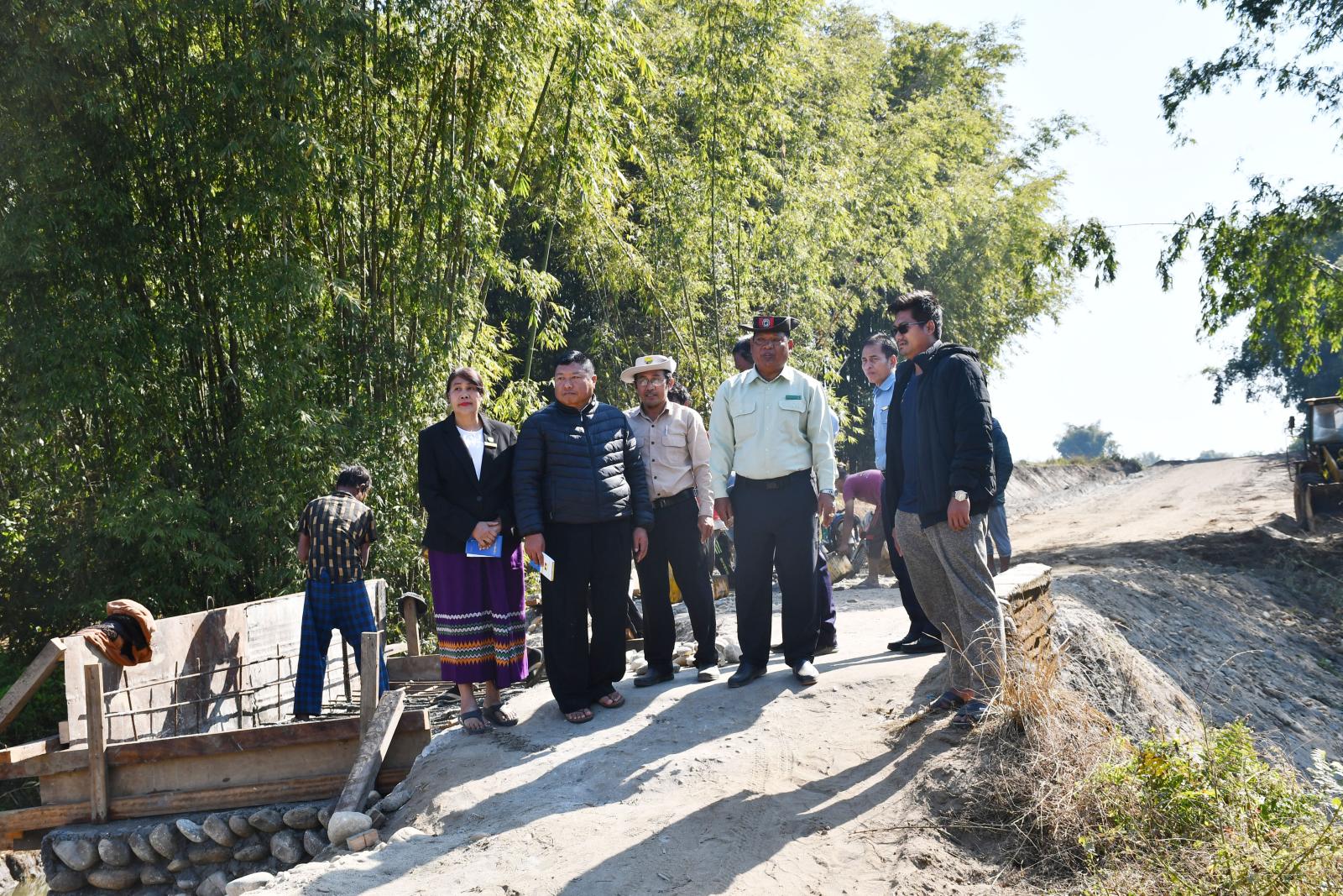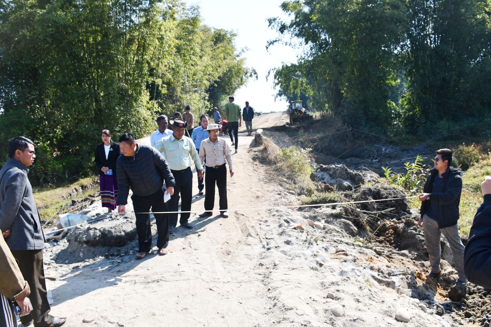 ဆက်လက်၍ ခရိုင်လမ်း၊ တံတားတည်ဆောက်ရေးလုပ်ငန်းစစ်ဆေးရေးအဖွဲ့ ဥက္ကဋ္ဌ ဦးစိုးထွန်းနှင့် အဖွဲ့ဝင်များသည် ၂၀၂၅-၂၀၂၆ ဘဏ္ဍာရေးနှစ် ပြည်နယ်ငွေလုံးငွေရင်းရန်ပုံငွေ ကျပ်သန်းပေါင်း(၄၆၀ ဒဿမ ၄၃၈) သန်းဖြင့် ပူတာအိုမြို့နယ်၊ နမ်ရှယ်ရှီးဒီကျေးရွာနှင့် နမ်ရှယ်စွပ်ကျေးရွာ ချင်းဆက်သွယ်လမ်းအရှည်(၁)မိုင်(၁) ဖာလုံအား သဲကျောက်လမ်းခင်းခြင်းလုပ်ငန်းကို JSJ ကုမ္ဗဏီက သဲကျောက်လမ်းခင်းခြင်းလုပ်ငန်း(၇၀)ရာခိုင်နှုန်း လုပ်ငန်းဆောင်ရွက်ပြီးစီးမှု အခြေအနေများအား ကွင်းဆင်းစစ်ဆေးပြီး ခရိုင်ကျေးလက်လမ်းဖွံ့ဖြိုးရေးဦးစီးဌာန ခရိုင်ဦးစီးမှူး ဦးဗိုလ်ဗိုလ်ကျော်နှင့် JSJ ကုမ္ဗဏီမှ တာဝန်ရှိသူများက လုပ်ငန်းဆောင်ရွက်ပြီးစီးမှု အခြေအနေများနှင့် လုပ်ငန်းလိုအပ်ချက်များကို ရှင်းလင်းတင်ပြကြရာ ခရိုင်လမ်း၊ တံတားတည်ဆောက်ရေးလုပ်ငန်း စစ်ဆေးရေးအဖွဲ့ ဥက္ကဋ္ဌက သတ်မှတ်အရည်အသွေးပြည့်မီရေး၊ အချိန်မီပြီးစီးရေးနှင့် လုပ်ငန်းခွင်အန္တရာယ်ကင်းရှင်းရေးတို့ကို ဆွေးနွေးမှာကြားသည်။