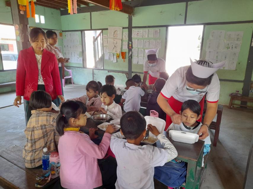 KG ကျောင်းသား/ကျောင်းသူများအား အာဟာရကျွေးမွေးရာတွင် မြို့နယ်ပြည်သူ့ကျန်းမာရေးနှင့် ကုသရေးဦးစီးဌာန မြို့နယ်ဦးစီးမှူး ဒေါက်တာအေးလွင်၊ မြို့နယ်မိခင်ကလေးကျန်းမာရေးဌာနမှ တာဝန်ရှိသူများက သက်ဆိုင်ရာ ကျောင်းအုပ်ဆရာကြီး/ဆရာမကြီးများနှင့် ဆရာ/ဆရာမများ ပူးပေါင်းပြီး KG ကျောင်းသား၊ ကျောင်းသူများအား တစ်ကိုယ်ရေသန့်ရှင်းရေးနှင့် ပတ်သက်သည့် အကြောင်းအရာများအား ရှင်းလင်းပြောကြားခဲ့ပြီး စနစ်တကျ လက်ဆေးနည်းများ၊ သွားခံတွင်း သန့်ရှင်းရေးလုပ်ငန်းများကို လက်တွေ့ဆောင်ရွက်ပေးခဲ့ပြီး ကြက်သားကြော်၊ ချဉ်ပေါင်းဟင်းရည်နှင့် အာဟာရပဲထမင်းများ ကျွေးမွေးခဲ့ကြောင်း မြို့နယ်ပြည်သူ့ကျန်းမာရေးနှင့် ကုသရေးဦးစီးဌာနမှ တာဝန်တစ်ဦးထံမှ သိရသည်။