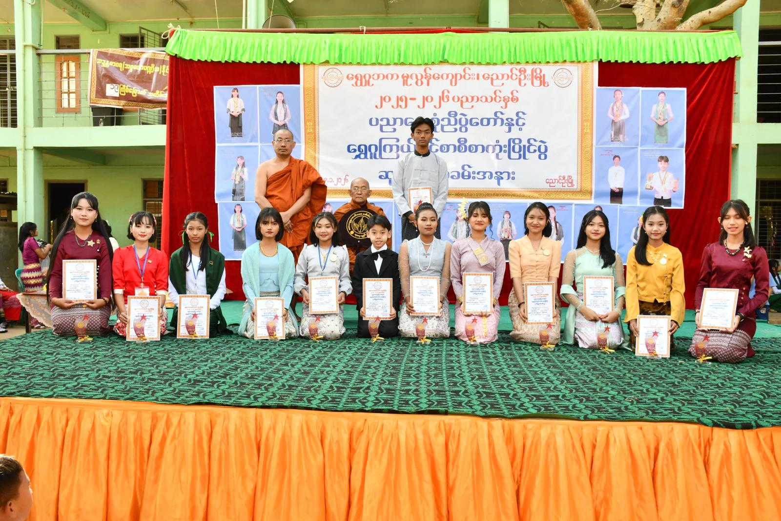 အခမ်းအနားတွင် ရွှေဂူဘကမူလွန် ကျောင်းသား၊ ကျောင်းသူလေးများက”ကြိုဆိုပါသည် စုံညီပွဲတော်” သီချင်းဖြင့် အခမ်းအနားကို စတင်ဖွင့်လှစ်ကာ ရွှေဂူဘကမူလွန် ကျောင်းအုပ်ဆရာတော် ဒေါက်တာရှင်ခေမိန္ဒမှအဖွင့်အမှာစကားမိန့်ကြားကာ ခရိုင်အဆင့်၊ မြို့နယ်အဆင့် လူရည်ချွန်ဆုများနှင့်တိုင်းဒေသကြီးအဆင့် အားကစားပြိုင်ပွဲဆုရ ကျောင်းသား၊ ကျောင်းသူများအား ကျောင်းအုပ်ဆရာတော် ဒေါက်တာရှင်ခေမိန္ဒက ဆုများ ပေးအပ်ချီးမြှင့်သည်။ ဆက်လက်၍ ၂၀၂၅-၂၀၂၆ ပညာသင်နှစ် ကျောင်းတွင်း ဘက်စုံလှုပ်ရှား ထူးချွန်ဆုများ၊မြို့ဆုရရှိသူများအား ဒုတိယကျောင်းအုပ်ဆရာတော်နှင့် ဆရာ၊ ဆရာမများက ဆုများ အသီးသီးပေးအပ်ချီးမြှင့်ခဲ့ကြောင်း သိရသည်။