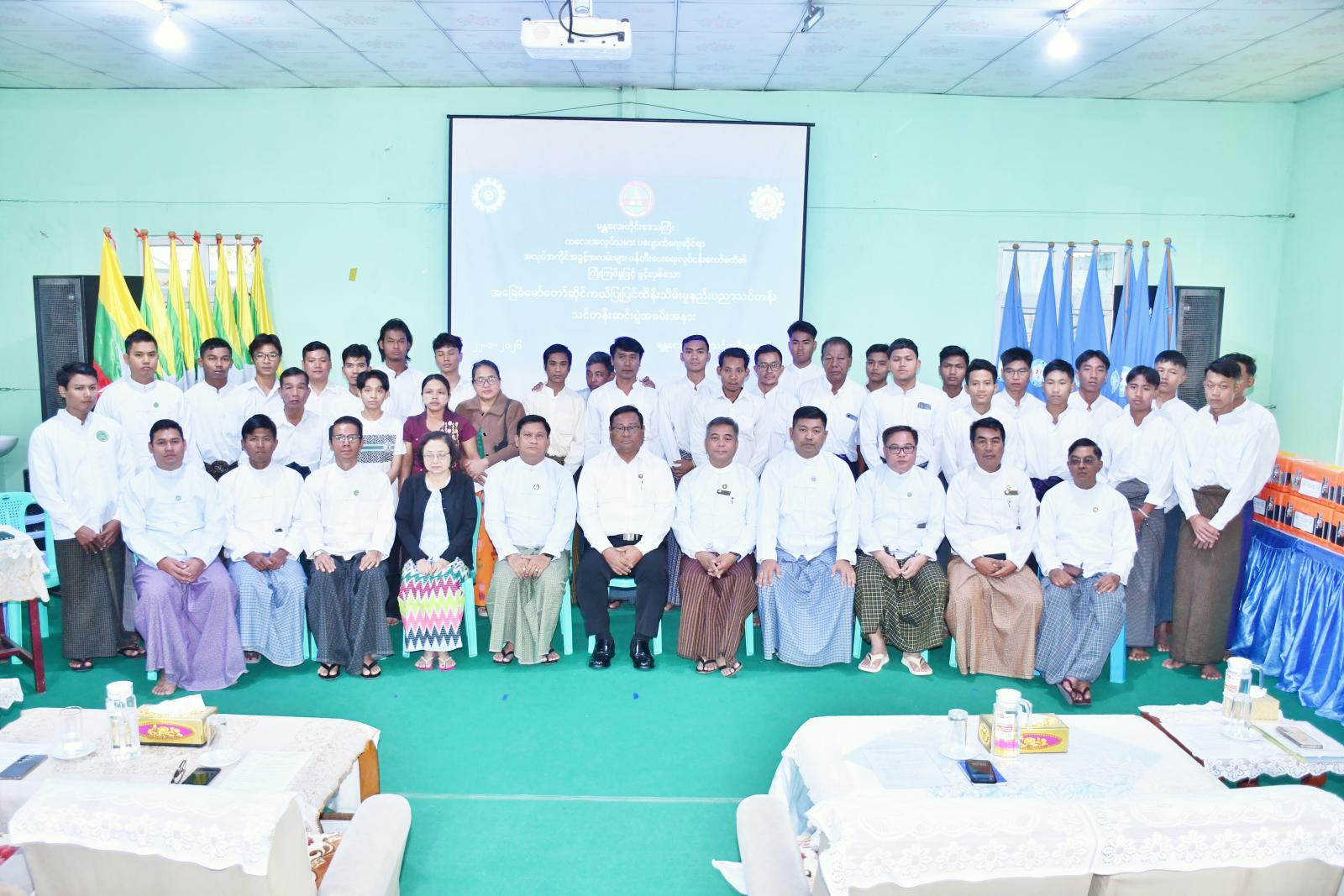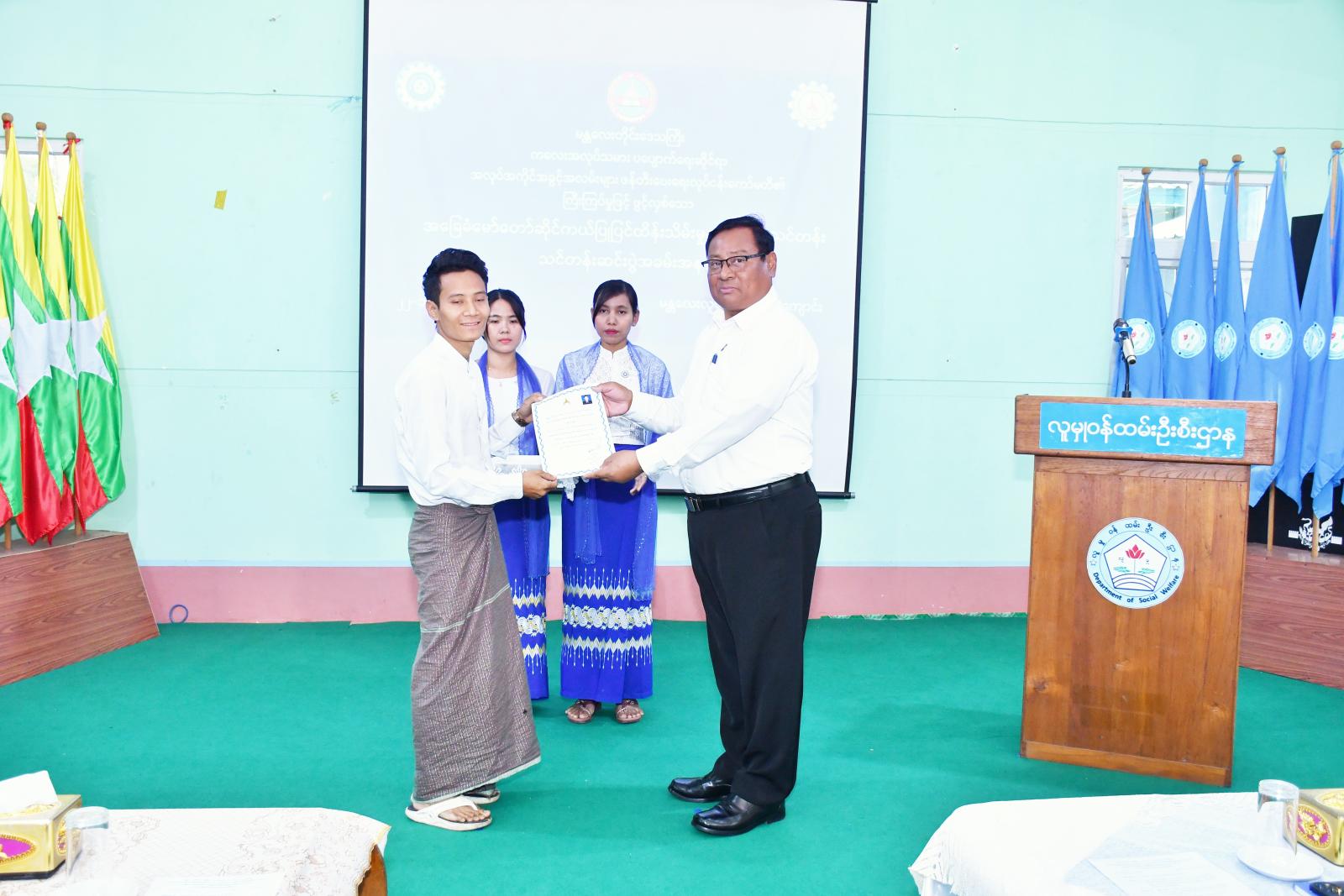 ထို့နောက် လူမှုရေးရာဝန်ကြီးက သင်တန်းနည်းပြ ၂ ဦးအား ဂုဏ်ပြုမှတ်တမ်းလွှာကိုလည်းကောင်း တာဝန်ရှိသူများက သင်တန်းသား၊သင်တန်းသူများအား သင်တန်းဆင်းလက်မှတ်များနှင့် မန္တလေးတိုင်းဒေသကြီး၊ ကုန်သည်များနှင့်စက်မှုလက်မှုလုပ်ငန်းရှင်များအသင်းက ထောက်ပံ့သော Tool Box များကို သင်တန်းသားများအား ပေးအပ်ပြီး သင်တန်းသူတစ်ဦးက ကျေးဇူးတင်စကားပြောကြားကာ စုပေါင်းမှတ်တမ်းတင်ဓါတ်ပုံရိုက်ကူးကြသည်။