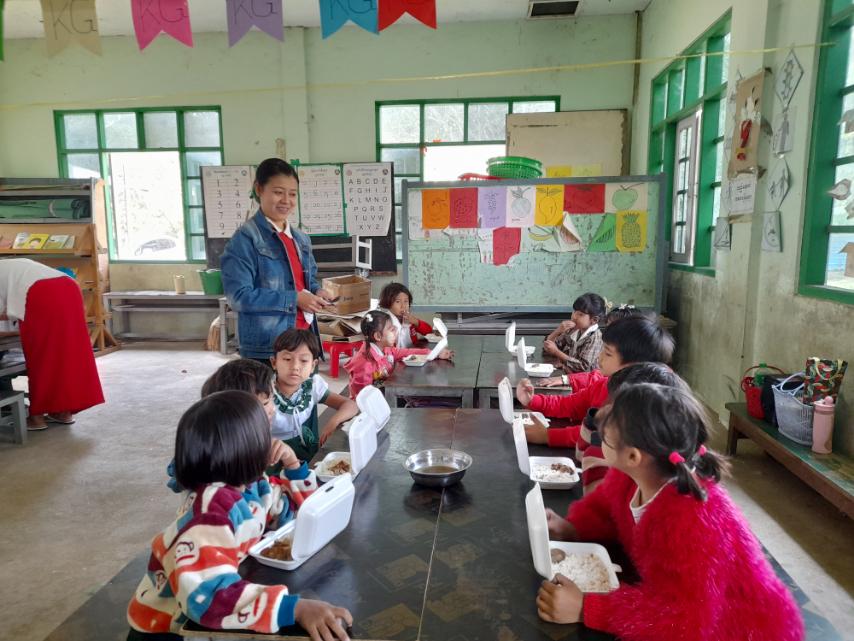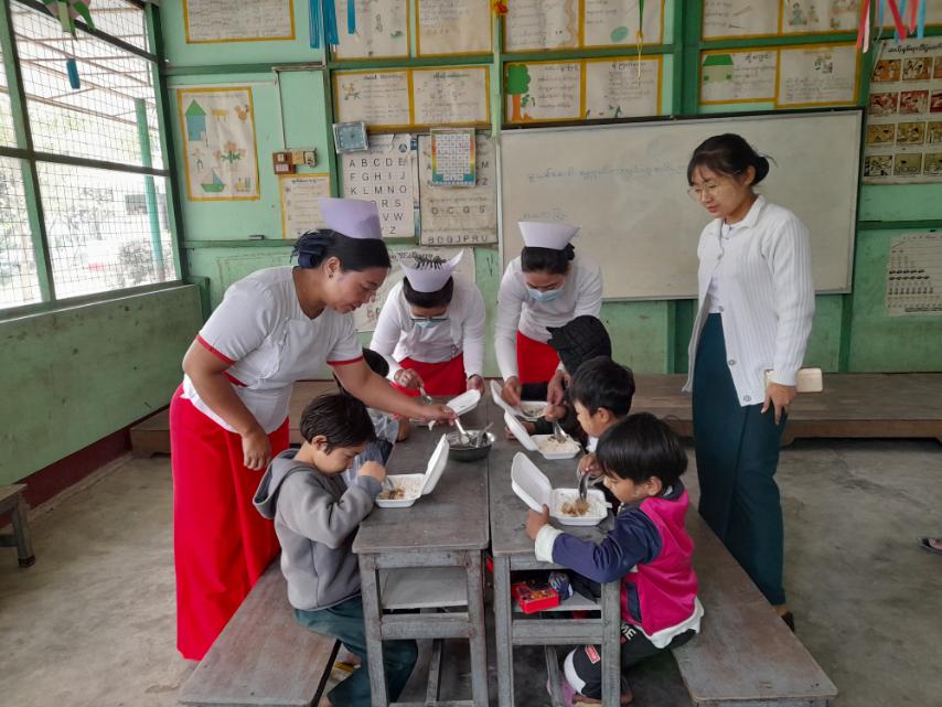 KG ကျောင်းသား/ကျောင်းသူများအား အဟာရကျွေးမွေးရာတွင် မြို့နယ်ပြည်သူ့ကျန်းမာရေးနှင့် ကုသရေးဦးစီးဌာန မြို့နယ်ဦးစီးမှူး ဒေါက်တာအေးလွင်၊ မြို့နယ်မိခင်ကလေးကျန်းမာရေးဌာနမှ တာဝန်ရှိသူများက သက်ဆိုင်ရာ ကျောင်းအုပ်ဆရာကြီး/ဆရာမကြီးများနှင့် ဆရာ/ဆရာမများ ပူးပေါင်းပြီး KG ကျောင်းသား၊ ကျောင်းသူများအား တစ်ကိုယ်ရေသန့်ရှင်းရေးနှင့် ပတ်သက်သည့် အကြောင်းအရာများအား ရှင်းလင်းပြောကြားခဲ့ပြီး စနစ်တကျ လက်ဆေးနည်းများ၊ သွားခံတွင်း သန့်ရှင်းရေးလုပ်ငန်းများကို လက်တွေ့ဆောင်ရွက်ပေးခဲ့ပြီး ကြက်သားဟင်း၊ ချဉ်ပေါင်းဟင်းရည်နှင့် အာဟာရပဲထမင်းများ ကျွေးမွေးခဲ့ကြောင်း မြို့နယ်ပြည်သူ့ကျန်းမာရေးနှင့်ကုသရေးဦးစီးဌာနမှ တာဝန်တစ်ဦးထံမှ သိရသည်။