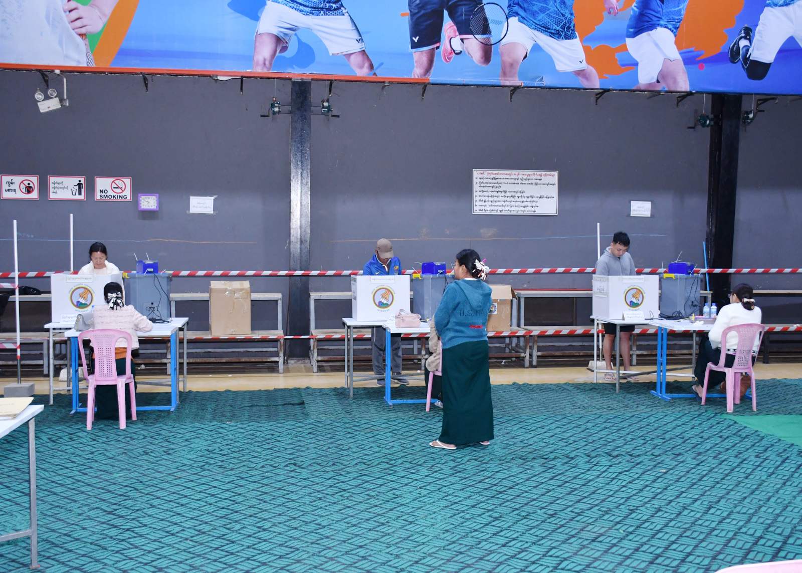 မြို့နယ်အတွင်းရှိ မဲရုံအသီးသီး၌ မဲရုံမှူး၊ ဒုတိယမဲရုံမှူးနှင့် မဲရုံအဖွဲ့ဝင်များက ရပ်ကွက်ရွေးကောက်ပွဲကော်မရှင်အဖွဲ့ခွဲဥက္ကဋ္ဌနှင့် အဖွဲ့ဝင်များ၊ မဲရုံကြီးကြပ်သူများ၊ ရွေးကောက်ပွဲစောင့်ကြည့်လေ့လာသူများနှင့် ပါတီကိုယ်စားလှယ်လောင်းများစသည့် အသိသက်သေများ ရှေ့မှောက်တွင် မြန်မာ့အလက်ထရောနစ် MEVM မဲပေးစက်မဲပုံးများ စစ်ဆေးခြင်း၊ လုံခြုံရေးကြိုးတပ်ဆင်ခြင်းနှင့် ကုတ်နံပါတ်များ စစ်ဆေးဆောင်ရွက်ပြီး နံနက် ၆ နာရီတွင် မဲရုံစတင်ဖွင့်လှစ်ရာ မဲဆန္ဒရှင်ပြည်သူများက မိမိတို့အမည်စာရင်းပါ သက်ဆိုင်ရာမဲရုံများတွင် အေးချမ်းလွတ်လပ်စွာ ဆန္ဒမဲပေးကြသည်။
