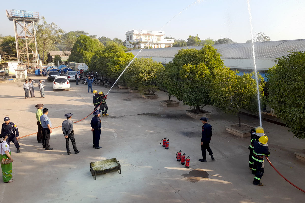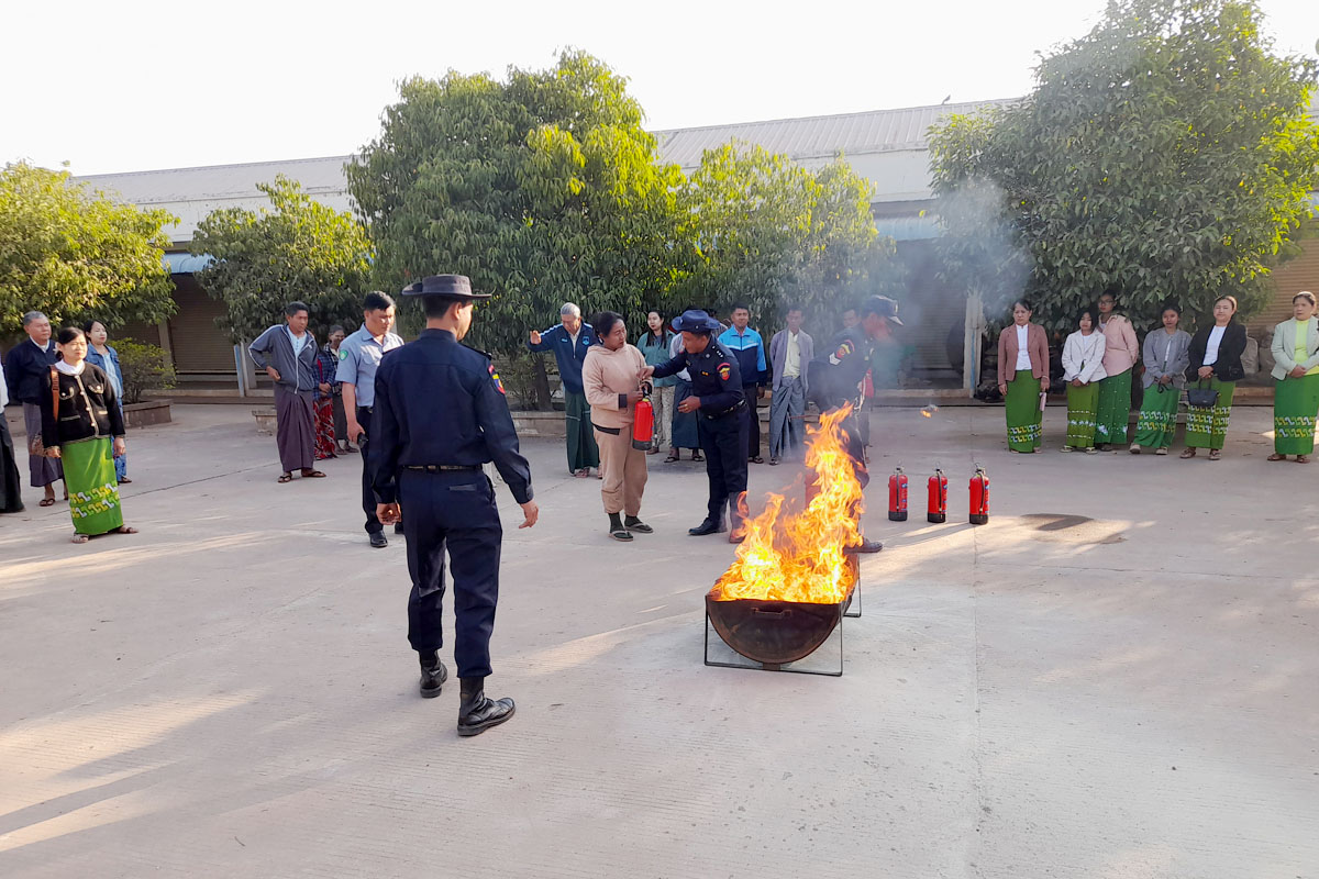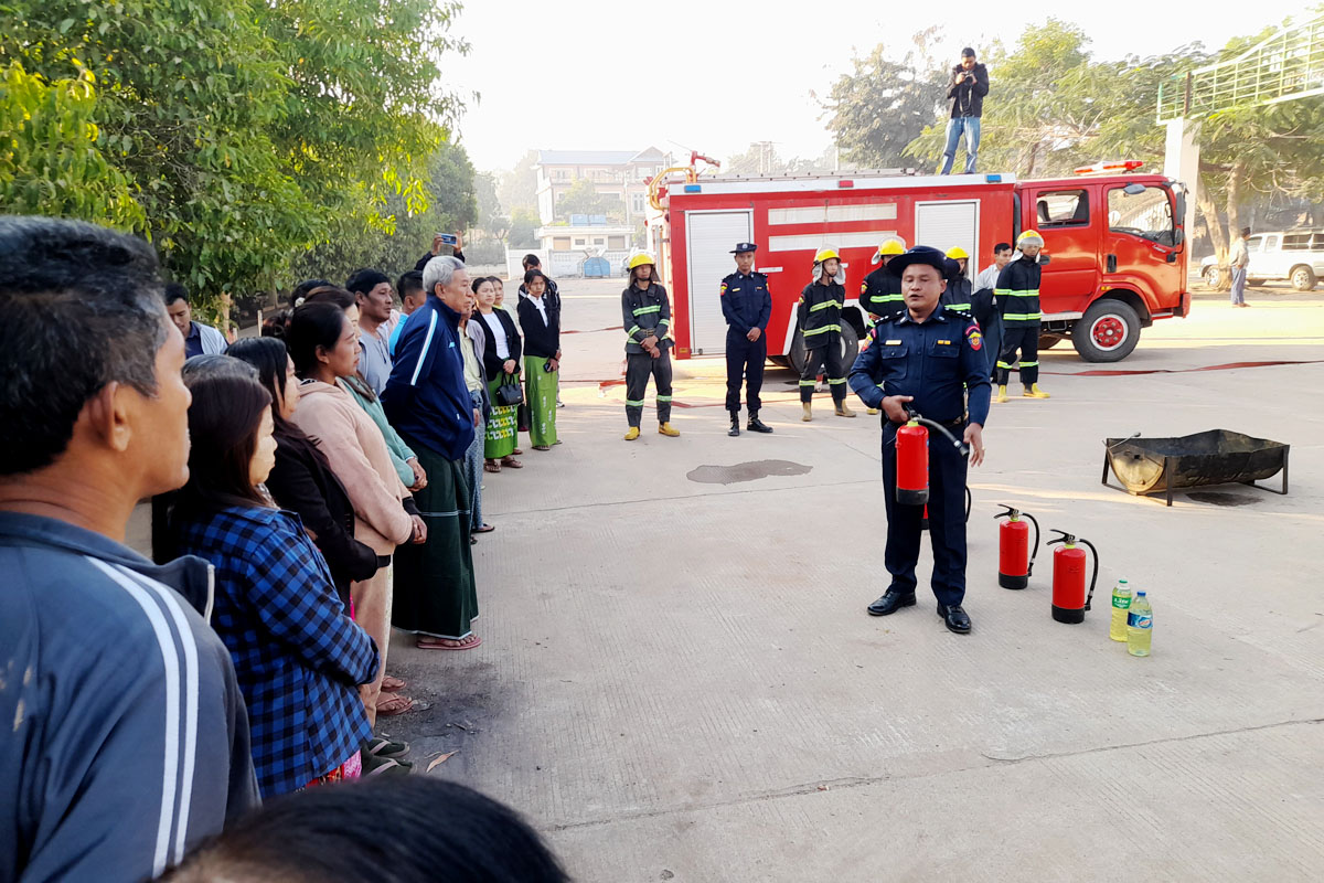 မီးဘေးလုံခြုံရေး အသိပညာပေးရာတွင် မြို့နယ် မီးသတ်ဦးစီးမှူး ဦးသန်းမြင့်က မီးလောင်မှုဖြစ်ပွား ရခြင်းအကြောင်းအရင်းများ၊ မီးလောင်မှုအတန်းအစား ၆ မျိုးနှင့် ဖြစ်ပွားမှုအများဆုံး မီးလောင်မှုများ၊ အရေးပေါ်မီးငြှိမ်းသတ်နည်းများနှင့် မီးသတ်ဆေးဘူး အသုံးပြုမီးငြှိမ်းသတ်နည်းများကို ရှင်းလင်း ဟောပြောသည်။ ယင်းနောက် မီးသတ်ဆေးဘူးဖြင့် အရေးပေါ်မီးငြှိမ်းသတ်နည်းကို မြို့နယ်စည်ပင် သာယာဝန်ထမ်းများ၊ ဈေးကော်မတီများ၊ ဈေးသူ/ဈေးသားများ ပူးပေါင်း၍ လက်တွေ့ ဆောင်ရွက်ကြသည်။ ယင်းနောက် မီးလောင်မှု/ မီးလန့်မှု ဖြစ်ပွားပါက အချိန်နှင့်တစ်ပြေးညီ ဆောင်ရွက်ရမည့် လုပ်ငန်းစဉ်များကို မီးသတ်ဝန်ထမ်းများ၊ ဈေးကော်မတီများနှင့် ဈေးသူဈေးသားများ ပူးပေါင်း မီးငြှိမ်းသတ်ခြင်းများကို ဇာတ်တိုက်လေ့ကျင့်ဆောင်ရွက်ခဲ့ကြသည်။ ထို့နောက် ဈေးများအတွင်း မီးဘေးလုံခြုံရေး ဆောင်ရွက်ထားရှိမှု၊ မီးသတ်ရေပိုက်များ အလွယ်တကူရေထုတ်ယူရရှိခြင်း ရှိ/မရှိနှင့် မီးသတ်ကား လွတ်ကင်းစွာဝင်ထွက်သွားလာနိုင်စေရေးတို့ကို မြို့နယ်မီးသတ်ဦးစီးမှူးနှင့် တာဝန်ရှိသူများက စစ်ဆေးကြပြီး မီးသတ်ဦးစီးမှူးက ဈေးကော်မတီဝင်များအား လိုအပ်သည်များ အကြံပြု ဆွေးနွေးမှာကြားသည်။