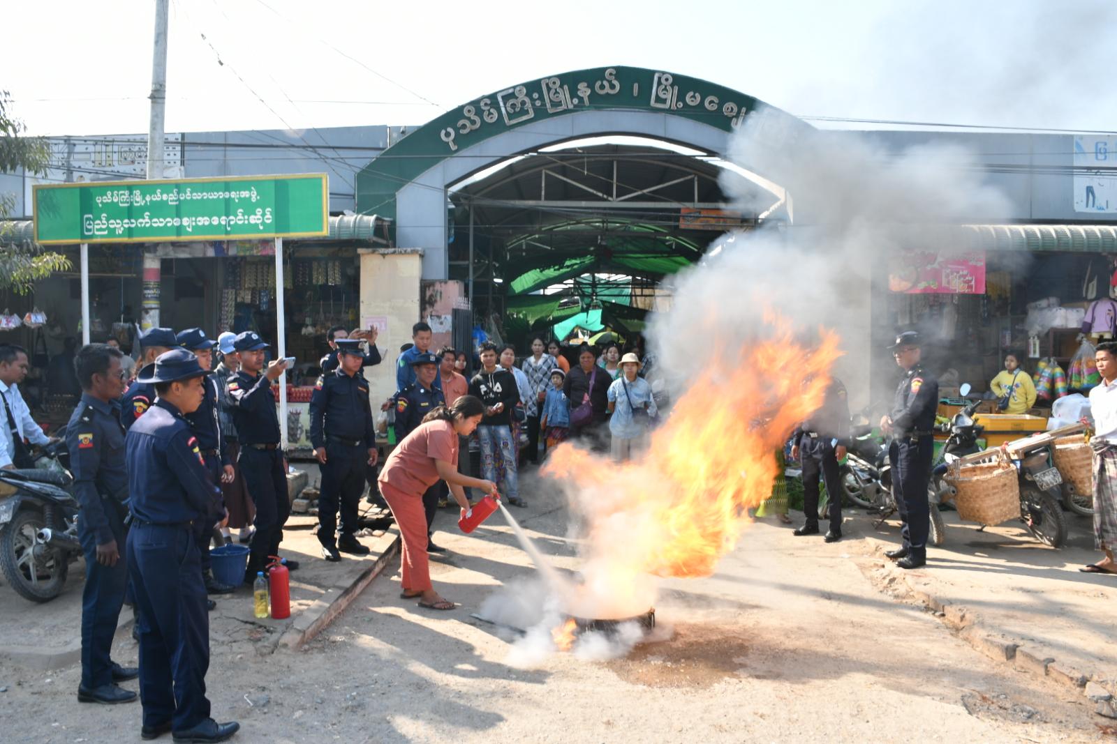 ထို့နောက် ဆီမီး၊ ဂတ်(စ်)မီး လက်တွေ့မီးငြှိမ်းသတ်ပုံများအား တာဝန်ရှိသူတစ်ဦးက ရှင်းလင်းပြောကြားပြီးနောက် ဈေးသူဈေးသားများ၊ ဈေးဝယ်လာသူများဖြင့် လက်တွေ့မီးငြှိမ်းသတ်ခြင်းများ ဆောင်ရွက်ကြသည်။ ဆက်လက်၍ မြို့မဈေးကြီးအတွင်း လှည့်လည်ကာ တစ်ဆိုင်ဝင်တစ်ဆိုင်ထွက် မီးဘေးအန္တရာယ်ကင်းဝေးစေရေး ကြည့်ရှုစစ်ဆေးကာ အသိပညာပေး လက်ကမ်းစာစောင်များ ဖြန့်ဝေပေးခဲ့ကြသည်။
