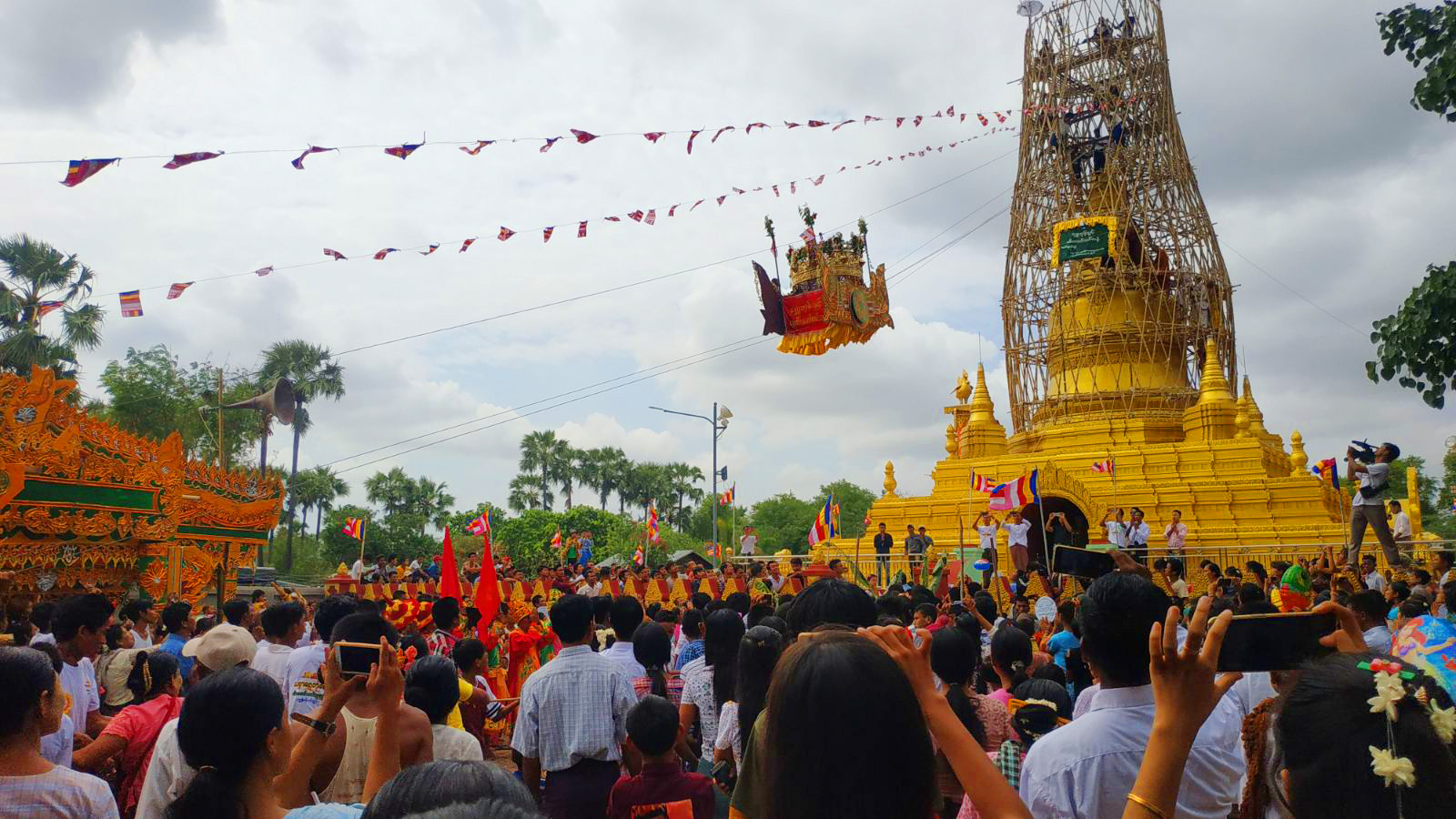 ရှေးဦးစွာ ရွှေထီးတော်အလှူရှင်မိသားစု ၊ ကျေးရွာဒေသခံစေတနာရှင်အလှူရှင်များ၊ ရပ်နီးရပ်ဝေးမှ အလှူရှင်များက ကျွန်းဖိုပင်ကျောင်းတိုက်ဆရာတော်နှင့် ပင့်သံဃာတော်များထံသို့ စိန်ဖူးတော်၊ ငှက်မြတ်နားတော်၊ ရွှေထီးတော်များကို ကပ်လှူပူဇော်ကြသည်။ ၎င်းနောက် စိန်ဖူးတော်၊ ငှက်မြတ်နားတော်နှင့်ရွှေထီးတော်များကို သံဃာတော်များ ၊ အလှူရှင် စေတနာရှင်မိသားစုများ၊ ကျေးရွာဒေသခံများက ပင့်ဆောင်၍ သစ္စာရွှေဘုံစေတီတော်မြတ်အား လက်ယာရစ်လှည့်ပတ် ပူဇော်ပြီး ရွှေထီးတော်တင်လှူပူဇော်ခြင်းကို စုပေါင်းဆောင်ရွက်ကြသည်။