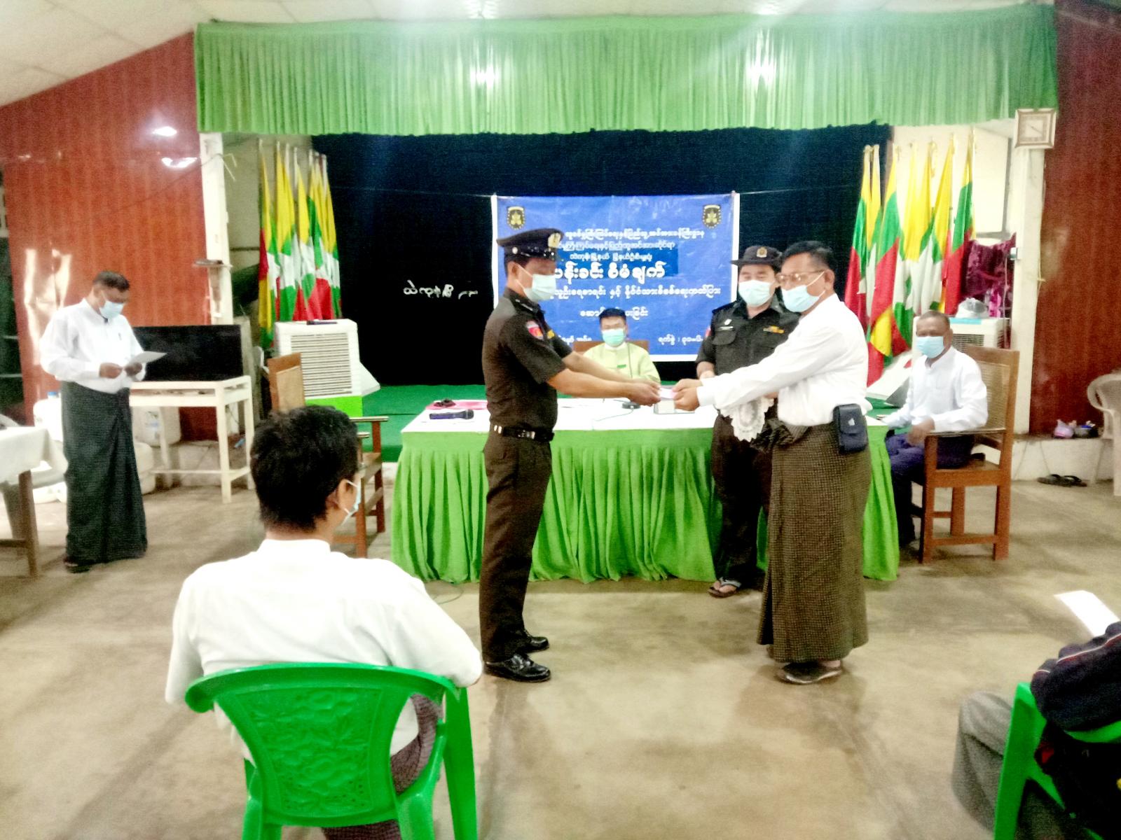 ထို့နောက် မြို့နယ်စီမံအုပ်ချုပ်ရေးအဖွဲ့ဥက္ကဌ၊ လူဝင်မှုကြီးကြပ်ရေးနှင့်ပြည်သူ့အင်အားဆိုင်ရာ မြို့နယ်ဦး စီးမှူးနှင့် မြို့နယ်စီမံအုပ်ချုပ်ရေးအဖွဲ့ဝင်များမှ ကျား(၆၂)ဦး၊ မ(၈၂)ဦး၊ ပေါင်း(၁၄၄)ဦးတို့အတွက် နိုင်ငံသားစိစစ်ရေးကတ်ပြားများကို တာဝန်ရှိသူများထံသို့ ပေးအပ်ခဲ့သည်။