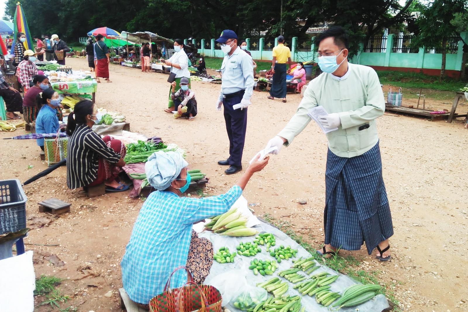 ထီးလင်းမြို့(ယာယီ)ပျံကျဈေးအတွင်း ဈေးရောင်း/ဈေးဝယ် ပြည်သူများအနေဖြင့် ပါးစပ်နှင့် နှာခေါင်းစည်း(Mask)များ စနစ်တကျ တပ်ဆင်ပြီးမှသာ ဈေးအတွင်းသို့ ဝင်ရောက်၍ ဈေးရောင်း ဈေးဝယ်ခြင်း ပြုလုပ်ကြရန်၊ ဈေးသည်များအနေဖြင့် တစ်ဦးနှင့်တစ်ဦး ၆ ပေစီ ခွာ၍ ရောင်းဝယ်ကြရန်နှင့် ဈေးဝယ်ယူသူများအနေဖြင့်လည်း တစ်ဦးနှင့်တစ်ဦး ခပ်ခွာခွာနေ၍ ဝယ်ယူကြရန်၊ အသား၊ ငါး ရောင်းချသည့် ဈေးသည်များအနေဖြင့် ပါးစပ်နှင့် နှာခေါင်းစည်း (Mask)အပြင် မျက်နှာအကာ Face Shield, လက်အိတ်များ ဝတ်ဆင်ပြီးမှသာ ရောင်းချရန်၊ ကာကွယ်ရေး နည်းလမ်းများကို သတိပြုလိုက်နာစေရေးအတွက် တစ်ဦးနှင့်တစ်ဦး အသိပေးခြင်း၊ သတိပေးခြင်း ဆောင်ရွက်ကြရန်၊ အမှိုက်များအား အမှိုက်ပုံးအတွင်းသို့ စနစ်တကျ စွန့်ပစ်ကြပါရန် စသည်တို့ကို မြို့နယ် ကိုဗစ်-၁၉ ရောဂါ ကာကွယ်ထိန်းချုပ်ရေးနှင့် အရေးပေါ်တုံ့ပြန်ရေးကော်မတီဥက္ကဋ္ဌ၊ မြို့နယ်အုပ်ချုပ်ရေးမှူး ဦးမြသိန်းမောင်၊ ဒုတိယမြို့နယ် အုပ်ချုပ်ရေးမှူး ဦးရဲမင်းထွန်း၊ မြို့နယ်စည်ပင်သာယာရေးကော်မတီဥက္ကဋ္ဌ ဦးမြင့်ဆွေနှင့် အဖွဲ့ဝင်များ၊ မြို့နယ်စည်ပင်သာယာရေးအဖွဲ့ အမှုဆောင်အရာရှိ ဦးဘွေကီးအောင်နှင့် ဝန်ထမ်းများ၊ ဌာနဆိုင်ရာ တာဝန်ရှိသူများက ပူးပေါင်းဆောင်ရွက်ခဲ့ကြပြီး “မိမိကစ၍ ကာကွယ်ပါ” ပညာပေး လက်ကမ်းစာစောင်များကိုလည်း ဖြန့်ဝေပေးခဲ့ကြောင်း သိရသည်။