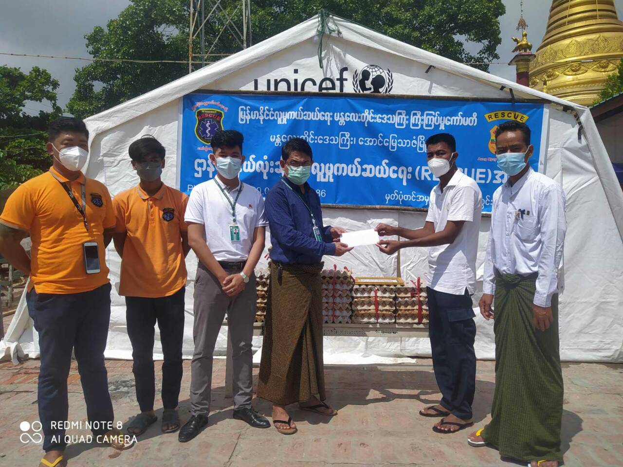 အလှူငွေနှင့်ကြက်ဥများလှူဒါန်းရာတွင် အလှူရှင်မိသားစုကိုယ်စား အရောင်းမန်နေဂျာ ဦးသူရိန်ထွန်းမှ ငွေကျပ်(၃)သိန်းနှင့် ကြက်ဥအလုံး(၁၀၀၀)တို့အား ပေးအပ်လှူဒါန်းရာ ဌာနီရှေ့နယ်လုံးဆိုင်ရာ လူမှုကယ်ဆယ်ရေးအသင်းဥက္ကဋ္ဌ ဦးရန်မျိုးအောင်နှင့် ဒုတိယဥက္ကဋ္ဌဦးစိန်လင်းတို့က လက်ခံရယူကြပြီး ဂုဏ်ပြုမှတ်တမ်းလွှာ ပြန်လည်ပေးအပ်သည်။