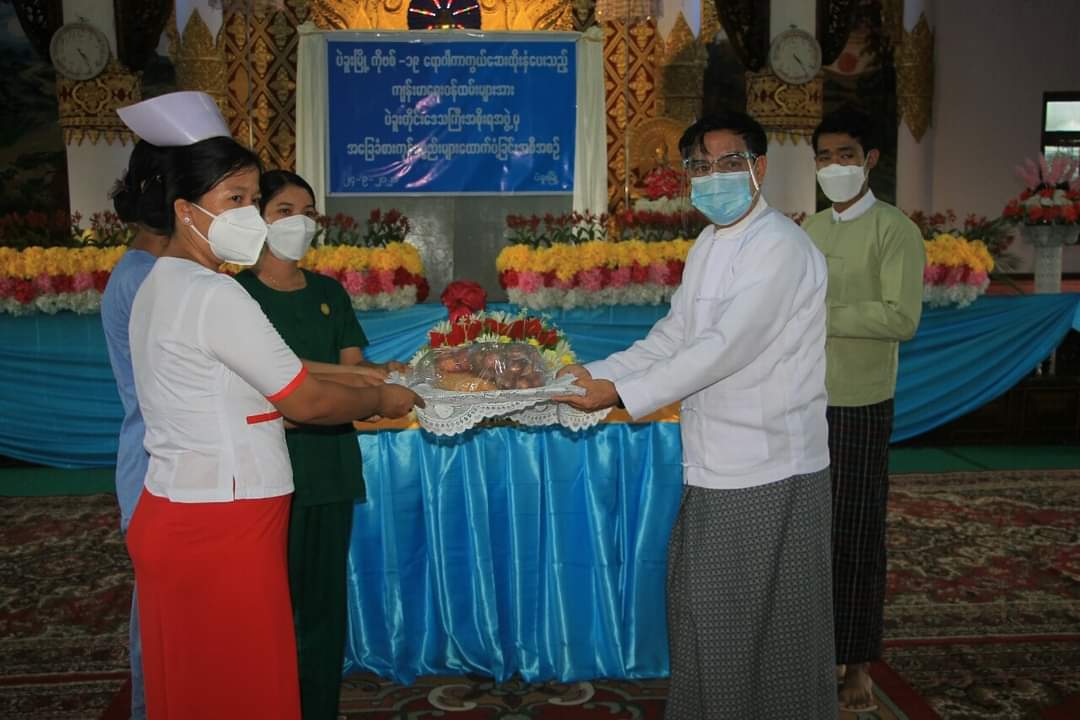 ထို့နောက် တိုင်းဒေသကြီးဝန်ကြီးချုပ် ဦးမျိုးဆွေဝင်းက ကိုဗစ်-၁၉ရောဂါ ကာကွယ်ဆေး ထိုးနှံရေးလုပ်ငန်းစဉ်တွင် ပါဝင်ဆောင်ရွက်ခဲ့သော ကျန်းမာရေးဝန်ထမ်းများ၊ အထွေထွေအုပ်ချုပ်ရေး ဦးစီးဌာန ဝန်ထမ်းများနှင့် Volunteer များအား ဆန်၊ ကြက်သွန်နီ၊ ကုလားပဲ၊ ဆား၊ ကြက်ဥတို့အား ထောက်ပံ့ပေးအပ်ခဲ့ရာ တာဝန်ရှိသူများက အသီးသီးလက်ခံရယူခဲ့ပြီး ဝန်ထမ်းများကိုယ်စား ကျန်းမာရေးဝန်ထမ်းတစ်ဦးက ကျေးဇူးတင်စကား ပြန်လည်ပြောကြားခဲ့ကြောင်း သိရှိရသည်။