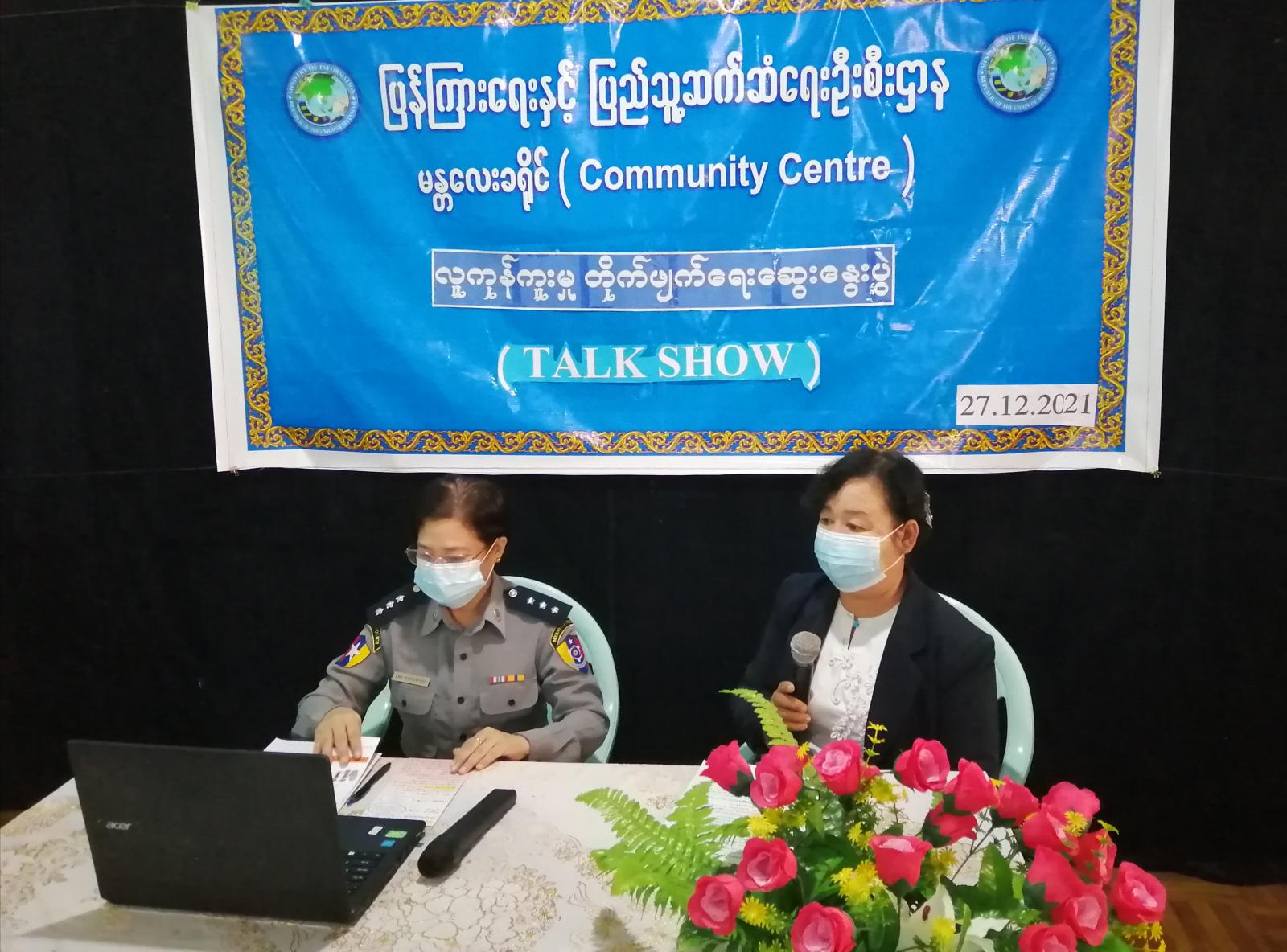 မန္တလေးခရိုင် ပြန်ကြားရေးနှင့် ပြည်သူ့ဆက်ဆံရေးဦးစီးဌာနနှင့် လူကုန်ကူးမှုတားဆီးနှိမ်နင်းရေးရဲ တပ်ဖွဲ့၊ ကလေးသူငယ် ကာကွယ်စောင့်ရှောက်ရေးတပ်ဖွဲ့စု (မန္တလေး)တို့ ပူးပေါင်းကျင်းပသော လူကုန်ကူးမှုတားဆီးကာကွယ်ရေး အသိပညာပေး(Talk Show)ကို မန္တလေးခရိုင် ပြန်ကြားရေးနှင့် ပြည်သူ့ဆက်ဆံရေးဦးစီးဌာနရှိ Community Centre ခန်းမတွင် ယနေ့ နံနက် ၁၀ နာရီက ကျင်းပ ပြုလုပ်ခဲ့သည်။