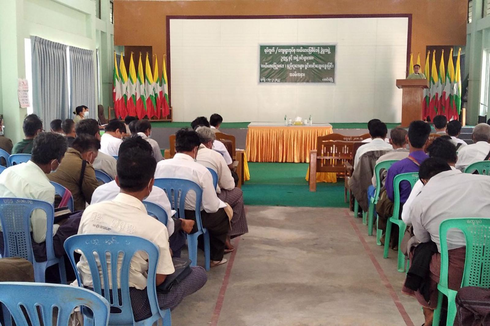 မကွေးတိုင်းဒေသကြီး သရက်ခရိုင်၊ အောင်လံမြို့နယ်၌ ရပ်ကွက်/ကျေးရွာအုပ်စု လယ်ယာမြေ စီမံခန့်ခွဲမှုအဖွဲ့ ဥက္ကဋ္ဌနှင့် အဖွဲ့ဝင်များအား လယ်ယာမြေဥပဒေ၊ နည်းဥပဒေများရှင်း လင်းဆွေးနွေးခြင်း အခမ်းအနားကို ယနေ့ နံနက် ၁၀ နာရီက မြို့နယ်အထွေထွေအုပ်ချုပ်ရေးဦးစီးဌာန အစည်းအဝေးခန်းမတွင် ပြုလုပ်ခဲ့သည်။