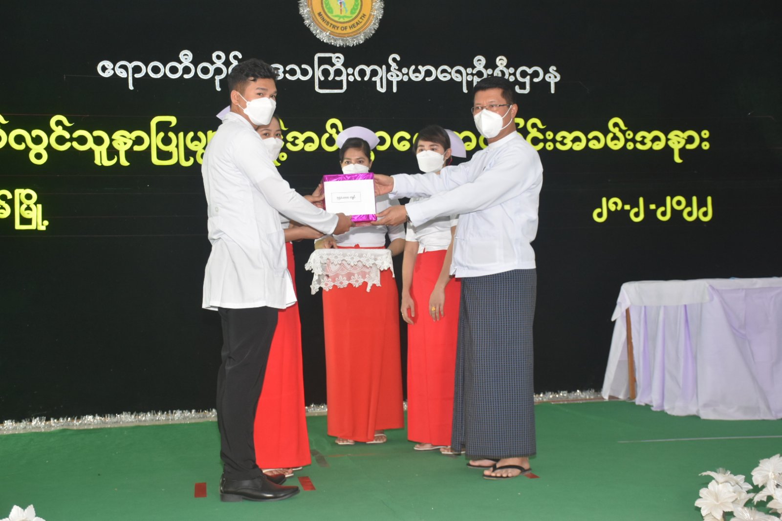 ထို့နောက် တိုင်းဒေသကြီး ဝန်ကြီးချုပ်မှ သစ်လွင်သူနာပြု(၃၇)ဦးအား ခန့်အပ်လွှာများနှင့် ချီးမြှင့် ထောက်ပံ့ငွေများ ပေးအပ်ခဲ့ပြီးနောက် အခမ်းအနားသို့ တက်ရောက်လာကြသူများနှင့် စုပေါင်းမှတ် တမ်းတင် ဓာတ်ပုံရိုက်ကူးခဲ့ကာ သစ်လွင်သူနာပြုများနှင့် ရင်းရင်းနှီးနှီး တွေ့ဆုံနှုတ်ဆက်ခဲ့ကြ ကြောင်း သတင်းရရှိသည်။