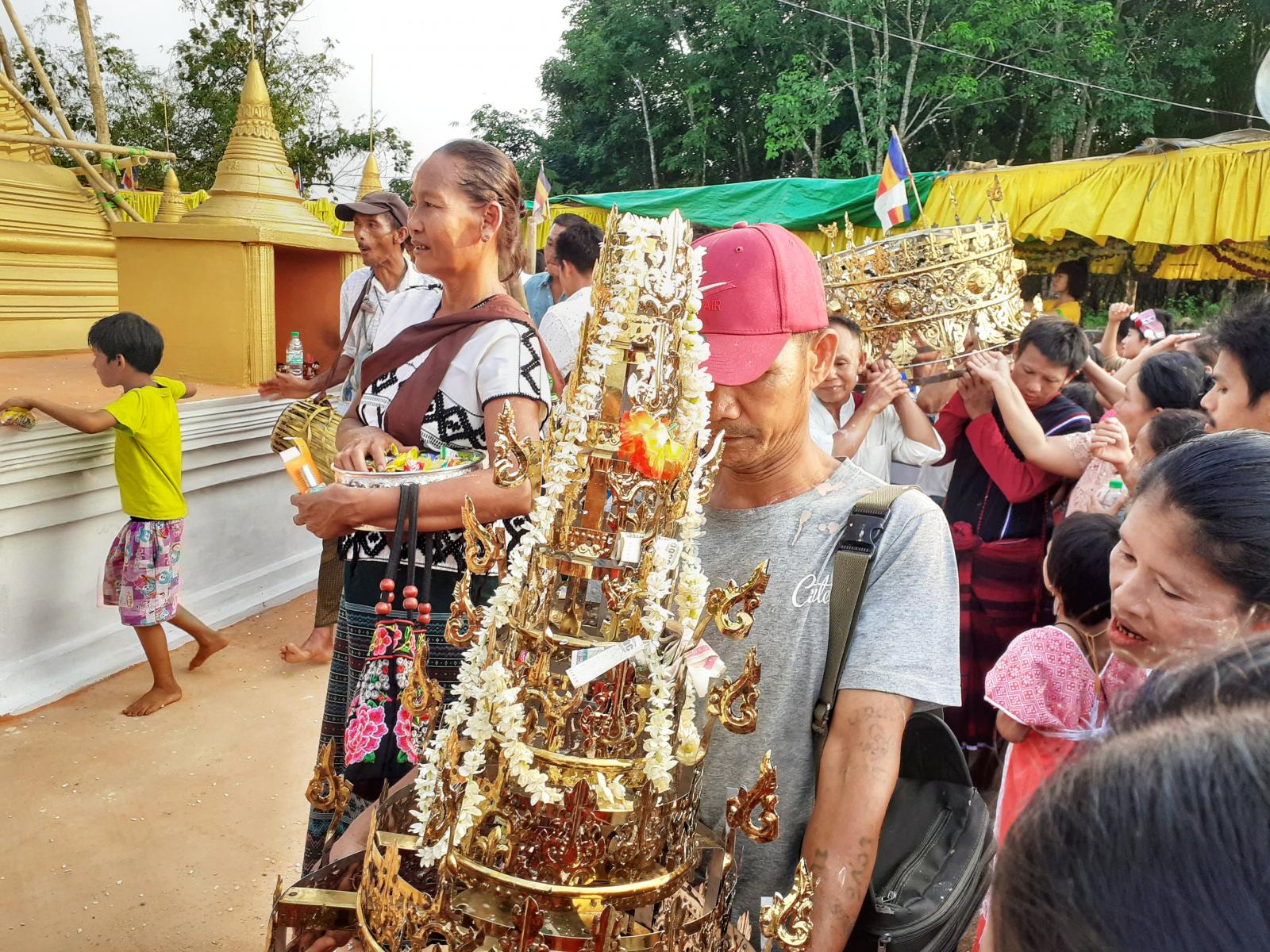 ရှေ့ဦးစွာ ဆရာတော်အရှင်သူမြတ်များထံမှ ငါးပါးသီလခံယူခြင်း၊ ပရိတ်တရားတော်များ ရွတ်ဖတ် ခြင်း၊ မင်္ဂလာအချိန်၌ မြစိမ်းတောင်ဘုရားတွင် ရွှေထီးတော်၊ စိန်ဖူးတော်၊ ဌက်မြတ်နားတော်တို့ကို လက်ယာရစ်လှည့်လည်အပူဇော်ခံပြီး ကျိုက်ဒုံမြို့ သန္တိသုခကျောင်းဆရာတော်၊ လေးဖိုးကျောင်း ဆရာတော်၊ ရွာလုံးတောင်ကျောင်းဆရာတော်၊ လယ်တောကြီး ကျောင်း ဆရာတော်၊ ပိုင်ကြည်ကုန်း ကျောင်းဆရာတော်တို့မှ ရွှေထီးတော်၊ စိန်ဖူးတော်၊ ငှက်မြတ်နားတော်တို့အား မြစိတ်တောင် ဘုရားတွင် တင်လှူပူဇော်ပြီး စည်ကားသိုက်မြိုက်စွာ ကျင်းပနိုင်ခဲ့ကြောင်း သိရသည်။