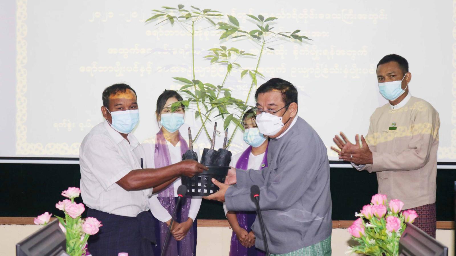 ထို့နောက် စိုက်ပျိုးရေးဦးစီးဌာန၊ တိုင်းဒေသကြီးညွှန်ကြားရေးမှူး ဦးသန်းထိုက်က ရေမြေဒေသနှင့် သက်တမ်းလွန်အပင်အို ရော်ဘာအစေ့ စိုက်မျိုးဟောင်းများနေရာတွင် ဒေသနှင့်ကိုက်ညီသော အထွက်ကောင်းရော်ဘာမျိုးများအစားထိုး စိုက်ပျိုးခြင်းဖြင့် ရော်ဘာတစ်ဧက အထွက်နှုန်းတိုးတက်ပြီး တစ်ဦးချင်းဝင်ငွေတိုးတက်ကာ လူမှုစီးပွားဘဝ ဖွံ့ဖြိုးတိုးတက်လာစေရန်၊ တစ်ဧကအထွက်နှုန်းနှင့် ရော်ဘာသစ် အထွက်တိုးလာစေရန် ရော်ဘာနှင့်သီးညှပ်စိုက်ပျိုးနိုင်သည့် ဥယျာဉ်ခြံသီးနှံများအား တောင်သူများ စိုက်ပျိုးဆောင်ရွက်လာစေရန် ရည်ရွယ်၍ ထောက်ပံ့ပေးအပ်ရခြင်း ဖြစ်ကြောင်း ပြောကြားသည်။