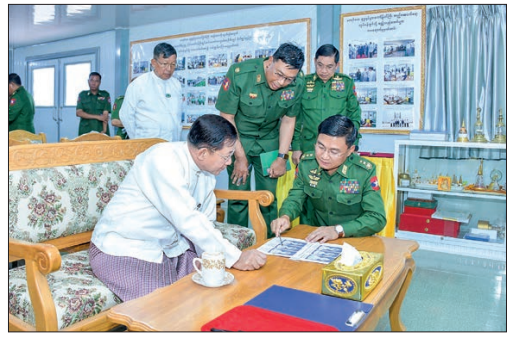 At the briefing hall, Lt-Gen Kan Myint Than of the Office of the Commander-in-Chief (Army) reported on accomplishments over the instructions given by the Senior General on 5 and 22 April, the carving of the image, progress of finished works, preparing to install the Unnalun sacred hair, the expression for weight and measurement of the image in QR Code, and Quartermaster-General Lt-Gen Kyaw Swa Lin on the construction of religious edifices, water fountain square, terrace, Gandakuti chamber, Musalinda Pond, Nagayon Pagoda, Sasana Beikman, stone inscription chamber Cetis, archways and progress of works.