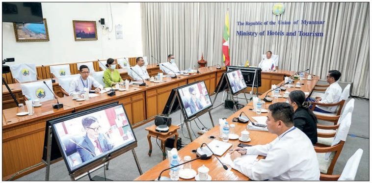 On 25 April, the Union Minister attended Myanmar-Saint Petersburg Tourism Forum via video conferencing and made a speech. He said the tourism sector is one of the promising sectors for promoting mutual benefits. Direct airway and payment systems are the most important matters. Efforts are being made for attracting more tourists from Russia to Myanmar by forming the Leading Committee and Work Committee which comprise the Government and private sector under the “Welcome Russia” programme. The ministry and Russia-Myanmar Friendship Association jointly arranged a tour for Russian singers, video producers and bloggers to Myanmar from 11 to 19 April.