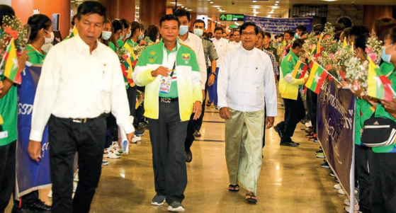 The sports team were welcomed back by Yangon Region Chief Minister U Soe Thein, Yangon Region ministers, officials from the Ministry of Sports and Youth Affairs, presidents from the Myanmar sports federations, and the public at Yangon International Airport.