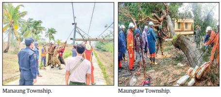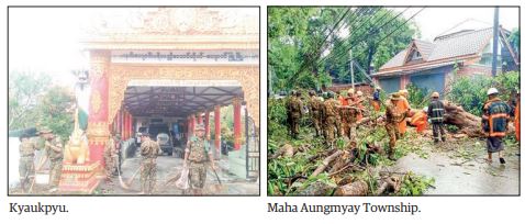 Due to Cyclone Mocha on 14 May, 12 houses, three religious buildings, one monastery, three schools, one airport lounge, eight lamp posts, one transformer and one wall were damaged and destroyed in 44 wards and villages of Nay Pyi Taw while two houses, one monastery, two departmental buildings in five wards and villages of Chin State, one house, three telecom towers, one lamp-post and three walls in seven wards and villages of Sagaing Region, 113 houses, two telecom towers, one lamp-post and one signboard in 72 wards and villages of Bago Region, two houses, nine lamp posts, three walls and 78 paddy files in 14 wards and villages of Magway Region, four religious building in Mandalay Region, 588 houses, three religious buildings, eight monasteries, 25 schools nine clinics, one market, one telecom tower, seven lamp-posts, one transformer, 26 departmental buildings and 181 losses in Mandalay Region, 15 houses, one monastery, four schools, one telecom tower, six departmental buildings and one football field in 35 wards and villages of Yangon Region, 131 houses, one religious building, five monasteries, 32 schools, five clinics, nine lamp posts and three departmental buildings in 114 wards and villages of Ayeyawady Region.
