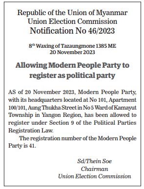 Submitted by moiuser on 21 November 2023 Republic of the Union of Myanmar Union Election Commission Notification No 46/2023
