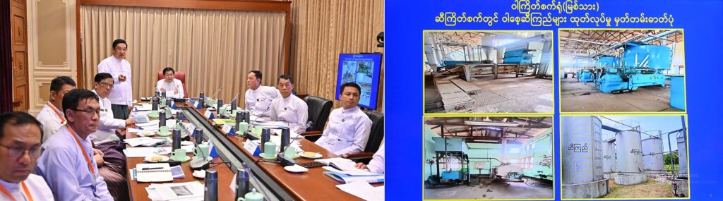 SAC member Lt-Gen Nyo Saw and Union ministers discussed the creation of employment opportunities based on the production of raw cotton at home, the ginning of cotton at State-owned and private factories, the ginning process of these factories used in foreign countries, the thread production process, import of raw materials abroad for production of threads, export of cotton, production of textiles by textile factories.
