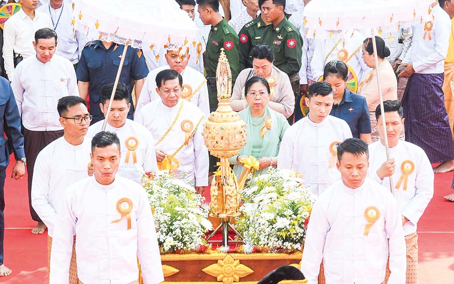 The Senior General, his wife, family and members conveyed the bejewelled diamond orb and the pennant-shape vane round the pagoda by the decorated float. Then, the wife of the Senior General, family members and those present conveyed the bejewelled diamond orb and the pennant-shape vane atop the pagoda.