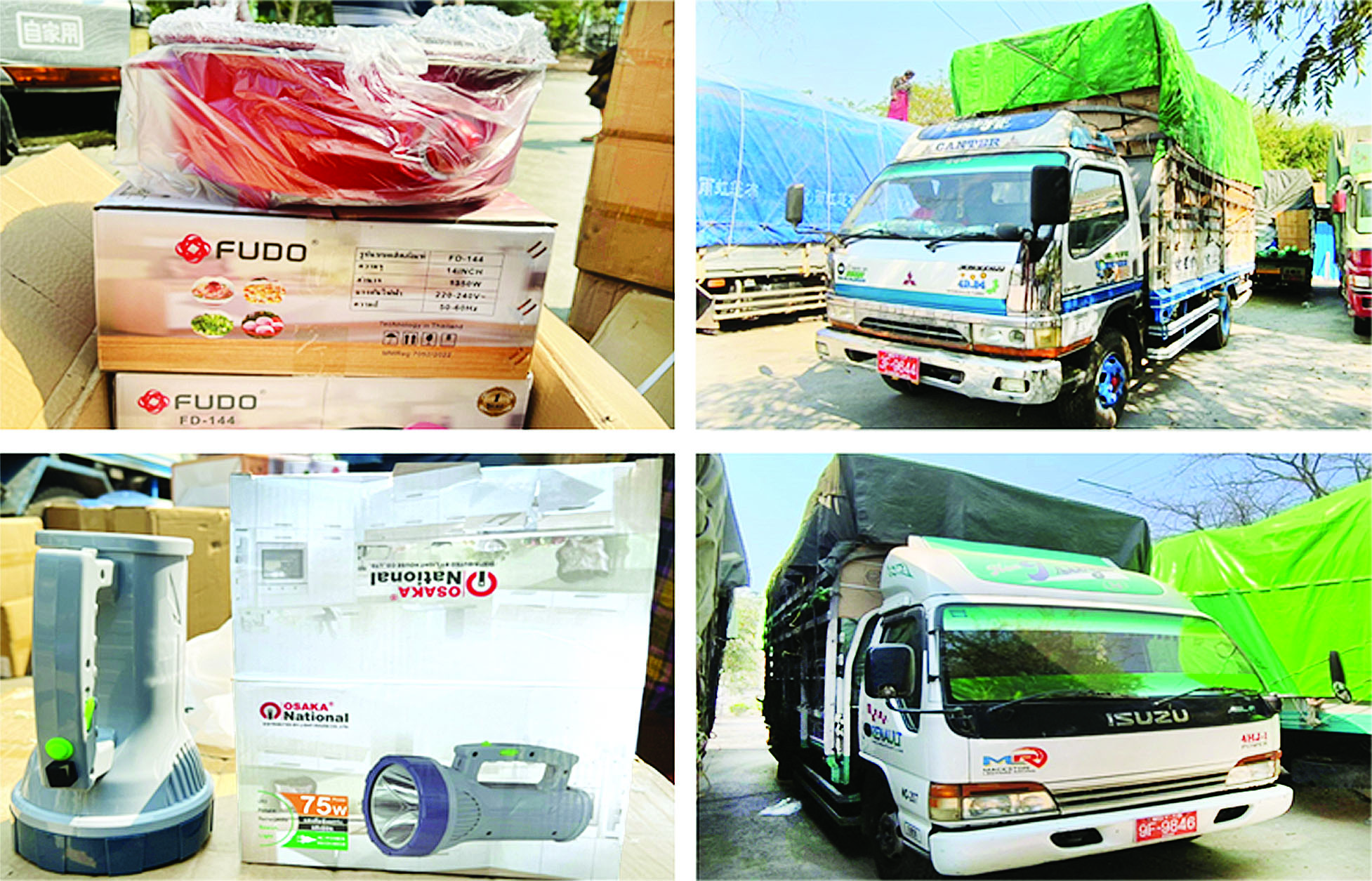 COMBINED teams supervised by the Mandalay Region Illegal Trade Eradication Special Task Force confiscated 1,126 electric pans without legal documents (approximately worth K12 million) which were carried by Mitsubishi Canter Truck (approximately worth K 16 million) on 14 March, three kinds of goods including 450 Osaka potable torches (approximately worth K9 million) carried by an Isuzu Light Truck (approximately worth K25 million) on 15 March, altogether approximately worth K62 million near the Myitnge-Htonbo tollgate. The action was conducted under Customs Procedures.