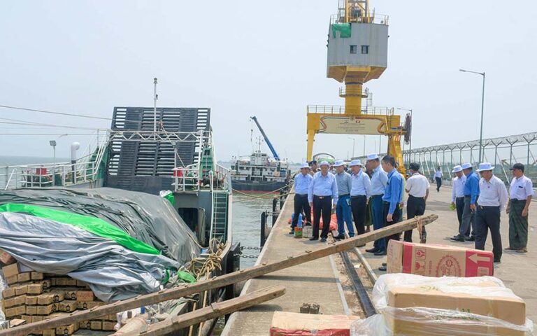 Rakhine State Chief Minister U Htein Lin and members of the state government and department officials inspected the arrival of consumer goods and construction materials from Yangon at Sittway Multipurpose Port yesterday afternoon.
