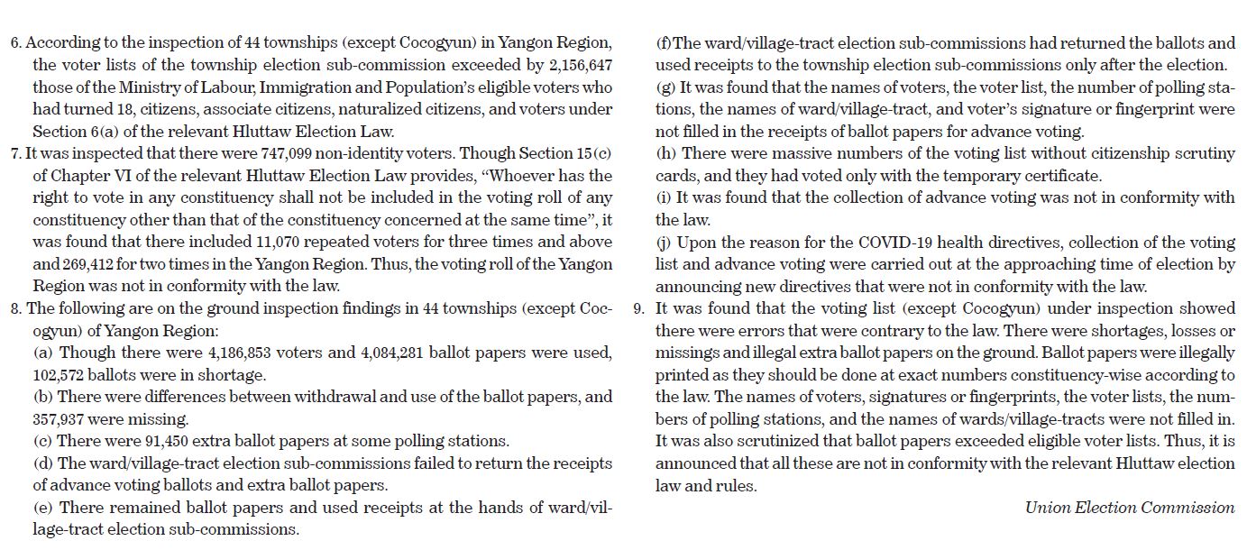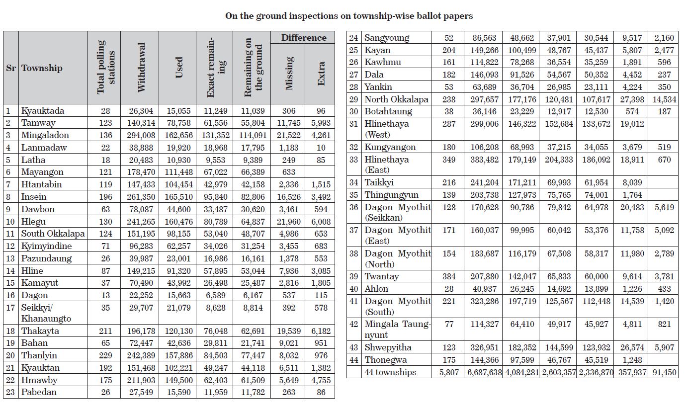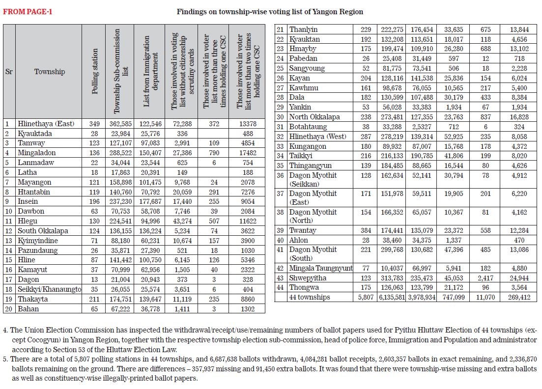 1. Regarding the Multiparty General Election held on 8 November 2020, the Union Election Commission has inspected the voter lists and on the ground withdrawal/ receipt/use/remaining of ballot papers of 44 townships (except Cocogyun) in the Yangon Region. 2. According to the inspection findings, the previous election commission released 6,135,581 eligible voters in 44 townships of the Yangon Region. The list of the Ministry of Labour, Immigration and Population in November 2020 showed 3,978,934 eligible voters who had turned 18. The voter lists mentioned that there were 747,099 citizens, associate citizens, naturalized citizens, and non-identity voters, 11,070 persons repeated on the voter lists more than three times and 269,412 persons repeated on the voter lists two times. 3. Findings in the inspection were as follows: