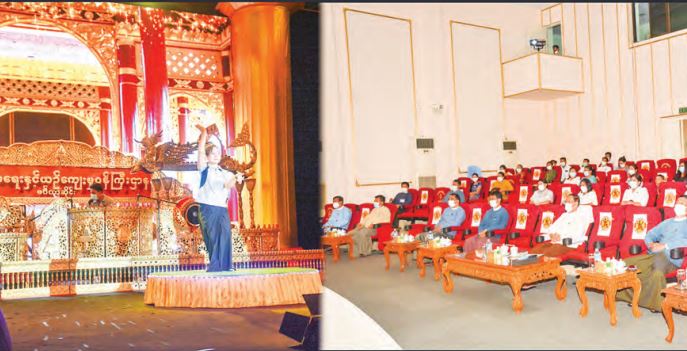 During his visit to the theatre, the Union Minister highlighted the duties to preserve the Myanmar traditional arts, to uplift national integrity, to conserve the cultural heritage, to improve the quality of arts, including cultural exchange programmes, and to support the practice sessions of Myanmar orchestra waing and traditional dances.