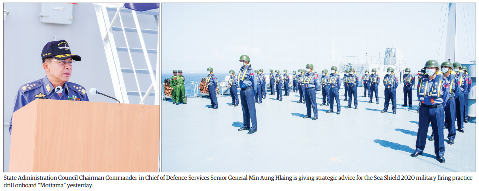 First, the Senior General and party arrived onboard the naval ship (Mottama) by helicopter to inspect the ships of the Three-Dimensional Naval Exercise-Sea Shield and was welcomed by Officer Scheduling Exercise (OSE) Rear-Admiral Htein Win, Naval Commander (Duty) Capt Tet Lwin Tun and senior military officers of the military drill. The commander-in-chief (Navy) reported on the purpose of the Sea Shield 2020 which is in accord with the guidance of the Senior General, and the Three-Dimensional Naval Exercise involving surface ships, submarine and helicopters. The Naval Commander (Duty) also reported on practical training. In response, the Senior General said priority should be given to hitting the targets precisely as it is a firing practice drill. He stressed the need to take lessons, to collect comprehensive information in connection with the requirements and the drill, to seriously take into account the task of blocking, preventing annihilating and to recount the important matters.