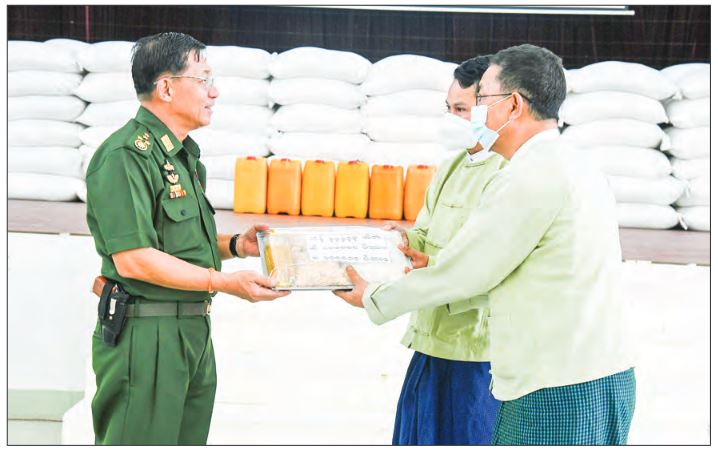At the town halls in Hlinethaya and Shwepyitha townships, the Senior General separately attended the ceremonies to present rice, cooking oil and gram donated by Tatmadaw (Army, Navy and Air) to local people from Hlinethaya and Shwepyitha townships.