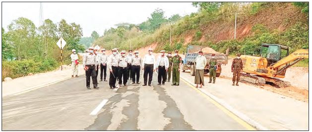 Naungin-Wan Sai (Lwe) Concrete Road is classified as Class A and consists of 4 miles of concrete road and 3 miles 6 furlongs of murram road. Implementing this road will benefit 17 villages, 927 households, and more than 5,000 people. It will be a lucrative route for domestic and foreign tourists.Afterwards, the Union Minister and party arrived at the construction site of Kengtung bypass (10 km long and 7-metre-wide) on the Meiktila-Taunggyi- Kengtung- Tachilek route. The Union Minister and the Commander said the con-struction of the bypass road would help alleviate traffic con-gestion in the city and traffic safety and the development of the surrounding villages and areas, adding that it is necessary to meet the set standards in line with the road features. They instructed to include the road signs and drainage works systematically and inspected the construction work.The official from the Bridge Department presented the status of the construction of the bridges on the Kengtung bypass and further work plans. The Union Minister instructed to systematically calculate and check the waterway situation and pay special attention to the quality of the bridges due to the new road construction.The Union Minister and the Commander inspected the mechanical widening, adjusting the slope of the road for the ups and downs of the mountain, the current condition of the road and planned a new lane and instructed the officials on the work requirements.