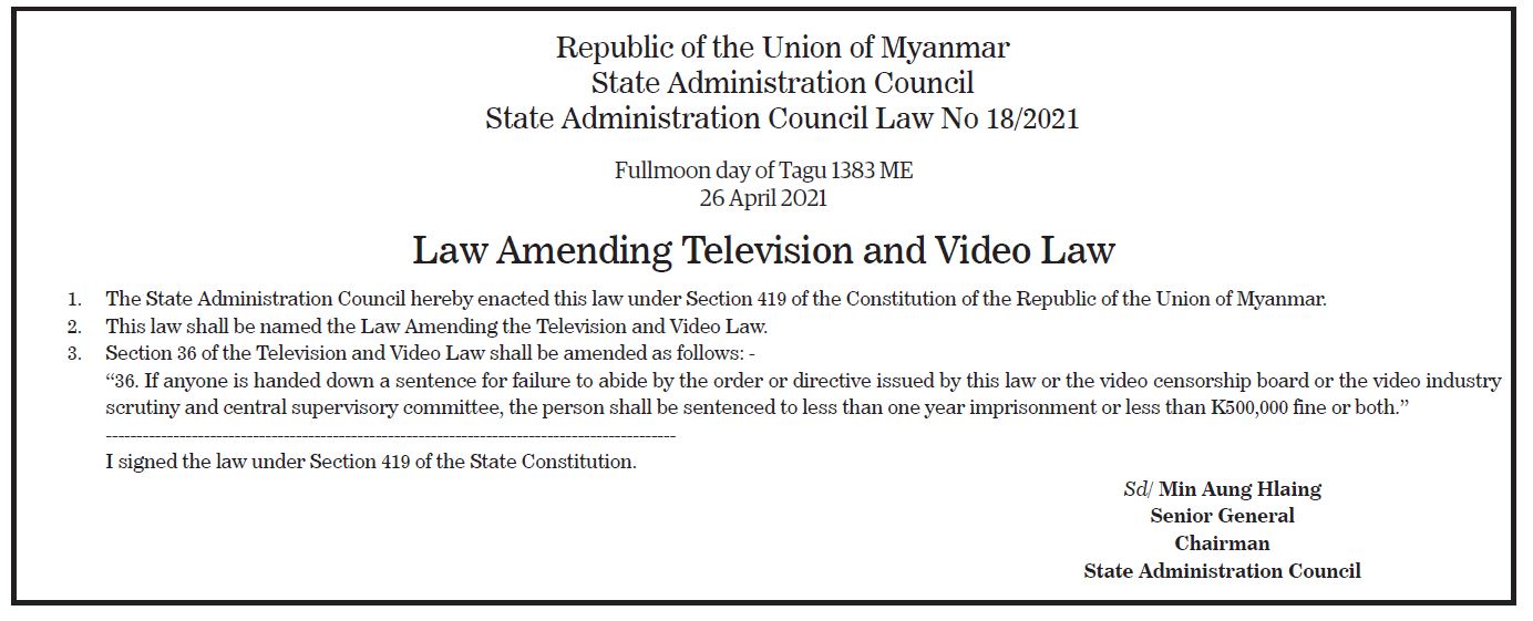 Submitted by moiuser on 27 April 2021 Law Amending Television and Video Law #TheGlobalNewLightOfMyanmar