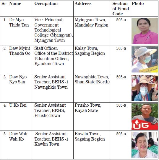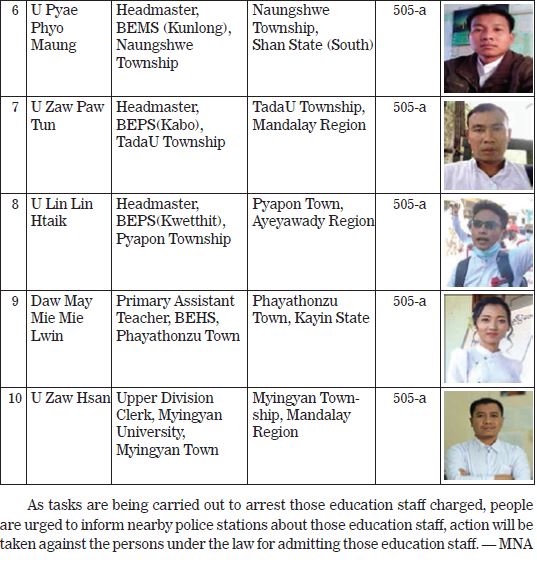 THE following eduction staff have been charged under Section 505-A of the Penal Code for inciting State service personnel and education staff to participate in CDM activities, themselves participating in it, supporting CDM activities and CRPH unlawful association with the aim of deteriorating the State administrative machinery.