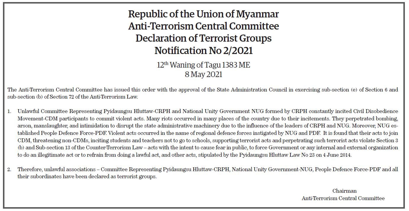 Submitted by moiuser on 14 May 2021 Republic of the Union of Myanmar Anti-Terrorism Central Committee Declaration of Terrorist Groups Notification No 2/2021 #TheGlobalNewLightOfMyanmar
