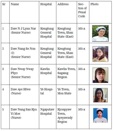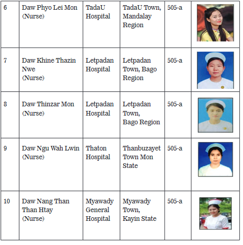 THE following nurses have been charged under Section 505-A of the Penal Code for inciting State service personnel and health staff to participate in CDM activities, them-selves participating in it, supporting CDM activities and CRPH unlawful association with the aim of deteriorating the State administrative machinery.