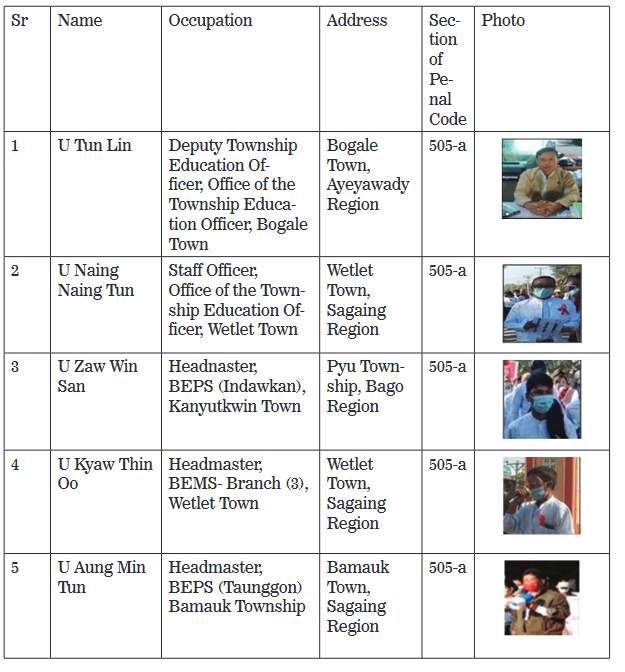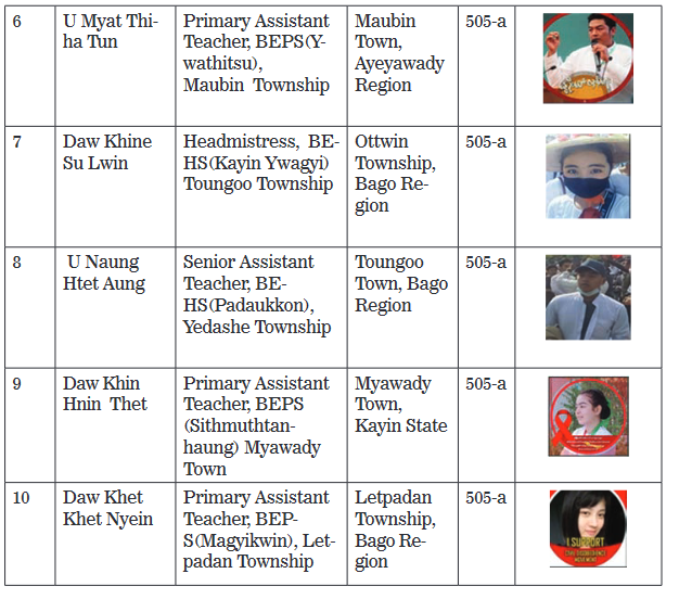 THE following teachers have been charged under Section 505-A of the Penal Code for inciting State service personnel and education staff to participate in CDM activities, themselves participating in it, supporting CDM activities and CRPH unlawful association with the aim of deteriorating the State administrative machinery