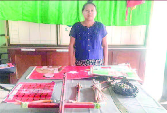 They arrested Daw Myat Mon Kyu, wife of U Mya Oo, together with three anti-State logans, one sword, one crossbow made of iron rod and 25 arrows.