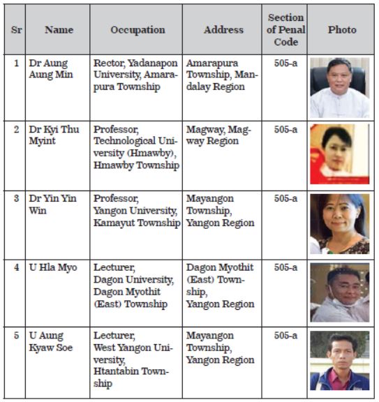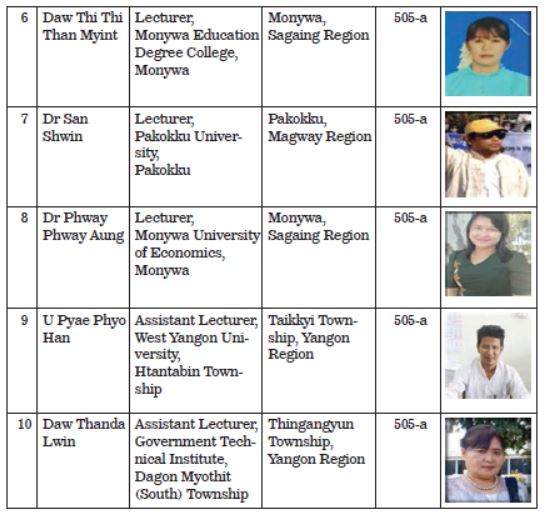 THE following teachers have been charged under Section 505-A of the Penal Code for inciting State service personnel and education staff to participate in CDM activities, themselves participating in it, supporting CDM activities and CRPH and NUG unlawful associations with the aim of deteriorating the State administrative machinery.