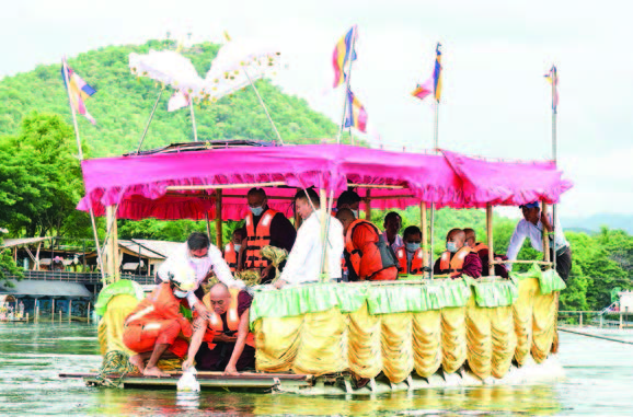 Then, the golden and silver urns of Sayadaw were conveyed onto the Karaweik decorated float and to the Paunglaung river bank. Sayadaws, monks, rela tives and devotees carried the urns onto the vessel docked at Paunglaung river bank.