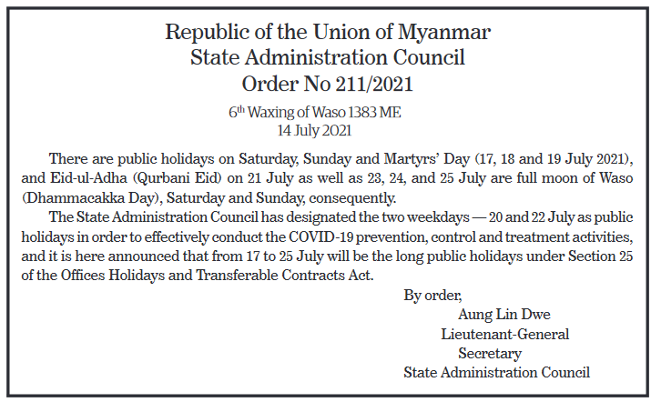 Submitted by moiuser on 15 July 2021 Republic of the Union of Myanmar State Administration Council Order No 211/2021 6th Waxing of Waso 1383 ME 14 July 2021