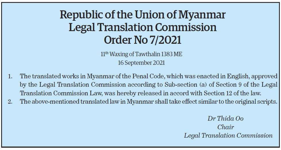 Submitted by moiuser on 18 September 2021 Legal Translation Commission Order No 7/2021 #TheGlobalNewLightOfMyanmar