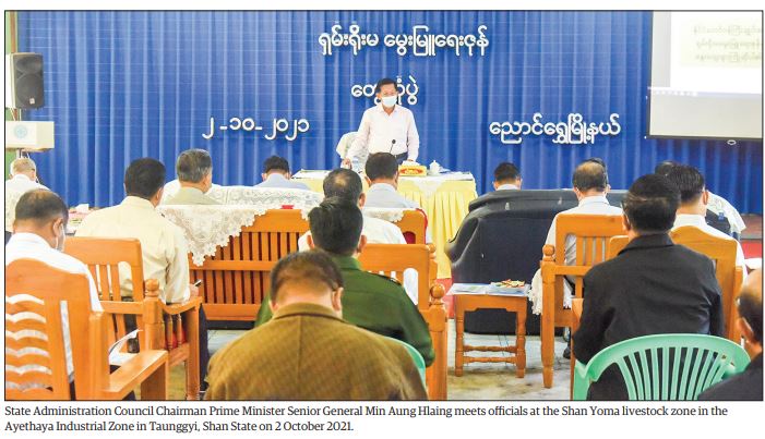 The Senior General heard reports on breeding tasks in Shan Yoma breeding zone, production of livestock products and requirements, the progress of industrial production in Ayethaya industrial zone, long term existence of Inlay Lake and future plans by officials.