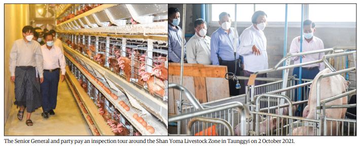 The Senior General visited the layer farm of Dr Sai Lon and the pedigree pig farm of Farm Myanmar Co Ltd in Shan Yoma livestock zone and discussed the development of the livestock sector.