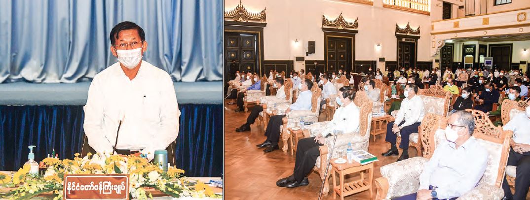 The Chief Minister of Yangon Region reported on social, economic, health and regional development tasks in the region, levying of tax and spending, efforts for the development of the industrial sector, the opening of COVID treatment centres, supply of electricity and water, efforts for the production of domestic products as import substitute ones and Yangon City Mayor U Bo Htay on the sanitation of the city and proper flow of water in drains, and traffic rules enforcement.