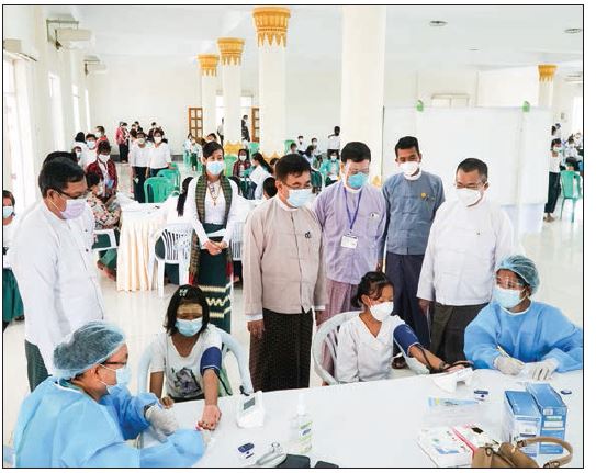 UNION Minister for Education Dr Nyunt Pe accompanied by Deputy Ministers Dr Zaw Myint and U Zaw Win visited vaccination campaigns at Mingala Byuha Dhamma Beikman building in Pyinmana Township, Nay Pyi Taw Council Area yesterday morning.