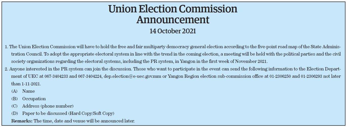 Submitted by moiuser on 16 October 2021 Union Election Commission Announcement #TheGlobalNewLightOfMyanmar