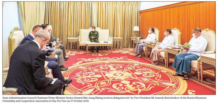 CHAIRMAN of the State Administration Council Prime Minister Senior General Min Aung Hlaing received a delegation from the Russia-Myanmar Friendship and Cooperation Association at the Tatmadaw guesthouse in Nay Pyi Taw yesterday morning.