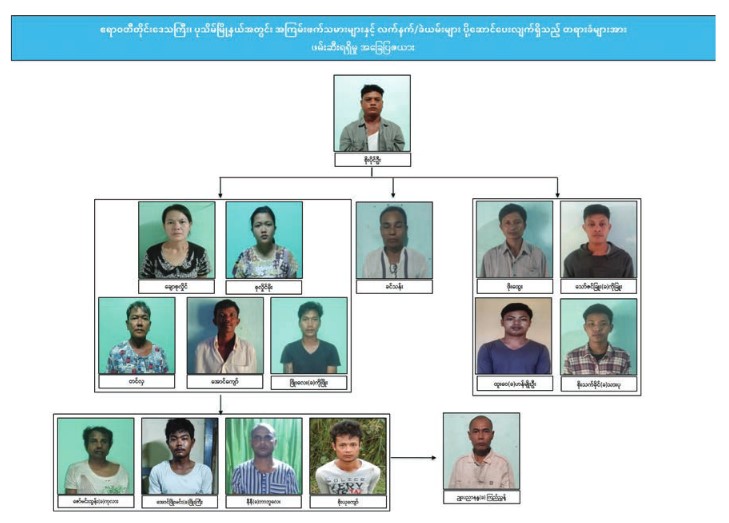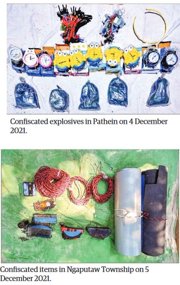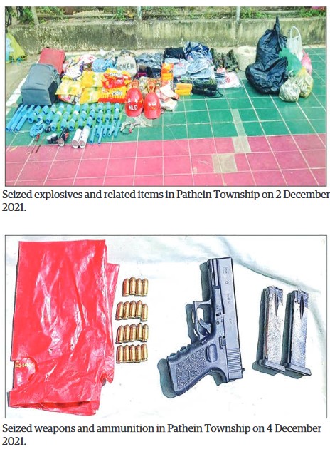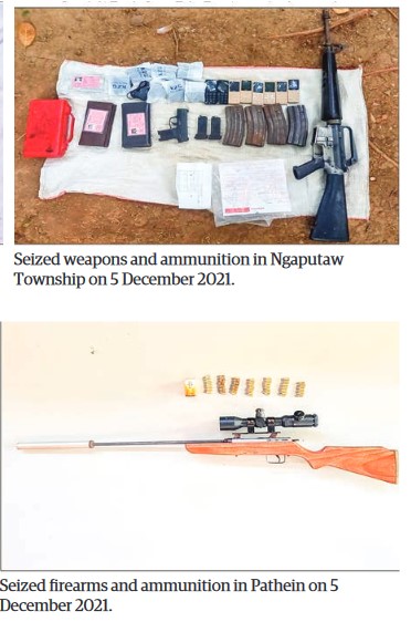 A total of 14 men and 2 women were arrested with four types of weapon, eight magazines, 203 rounds of ammunition, three mines, 55 detonators, five bags of gunpowder, three pipes prepared to make homemade guns, one laptop, two compasses, and related explosives between 2 and 5 December in Pathein Township, Ayeyawady Region.